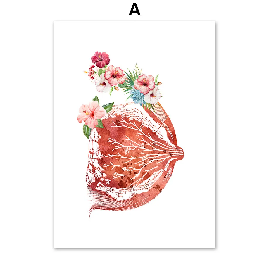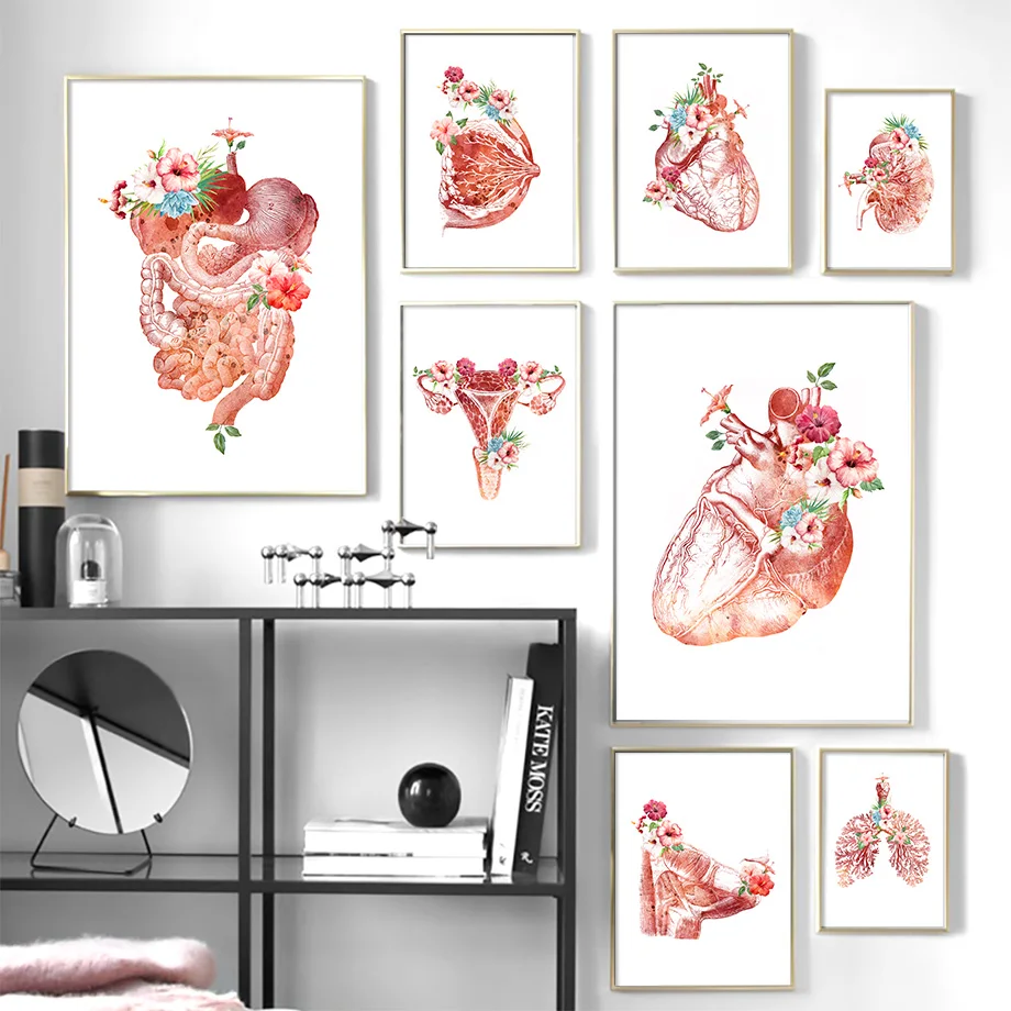 Плакаты с анатомическим рисунком, настенная живопись на холсте со скелетом, органом, цветком, грудью, маткой, почекой, печенью, декоративные картины для врачей