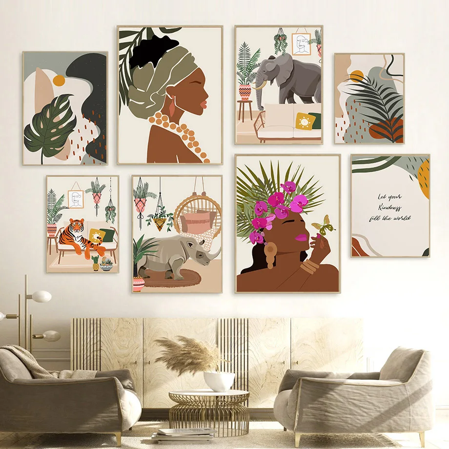 Абстрактная Африканская женщина цветок листья Настенная картина хол...