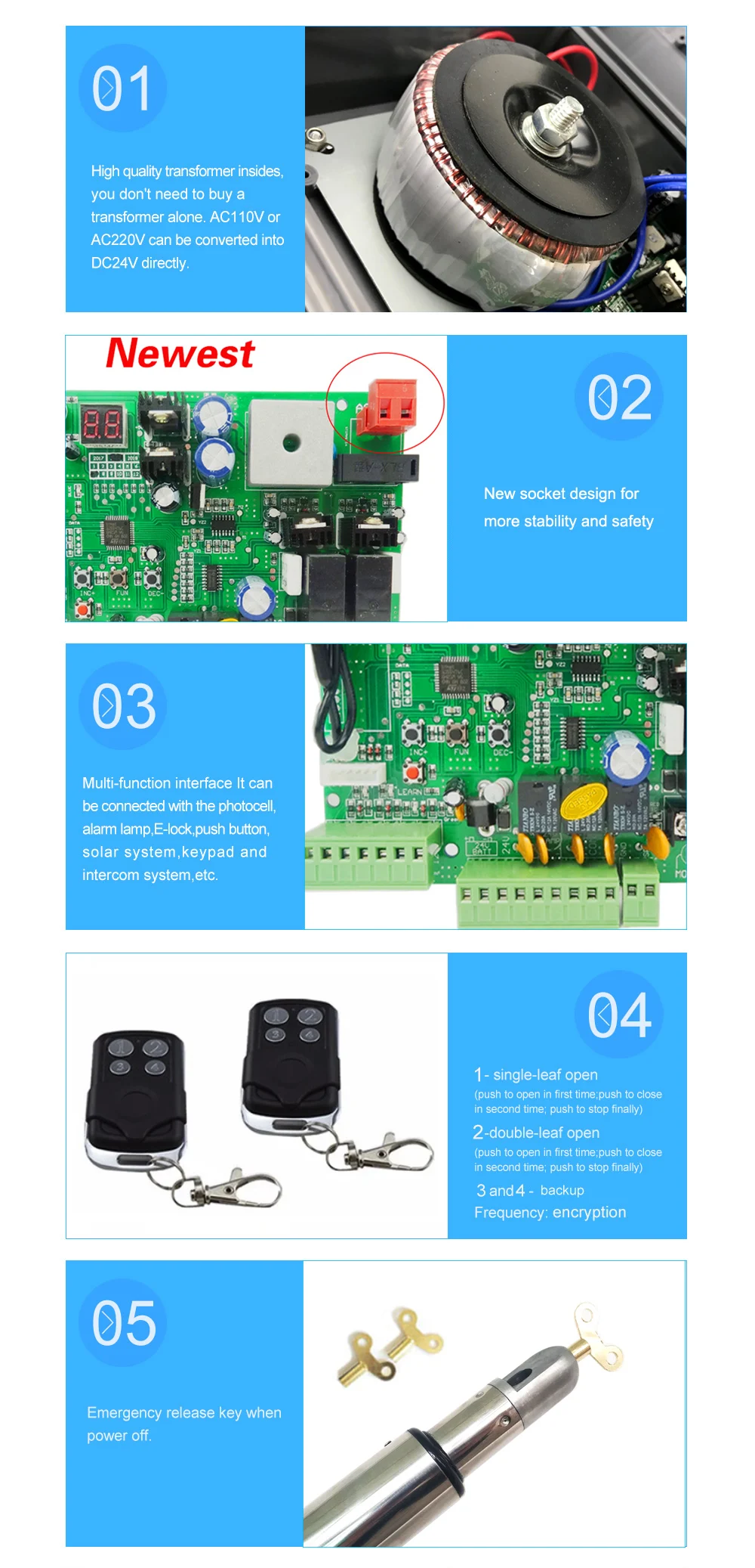 Интеллектуальная панель управления Введение функции:Цифровой светодиодный меню обеспечивает легкую настройку, возможность подключи и играй, чтобы установить пешеходный режим, регулируемое рабочее время, регулируемое сопротивление, чувствительность, Настройка автоматического закрытия, терминал, доступный для циклического детектора, фотоэлемента, кнопки, клавиатуры, оборудование контроля доступа и т. Д. Пользовательский код прокатки делает систему более безопасной, высокая Противоугонная производительность