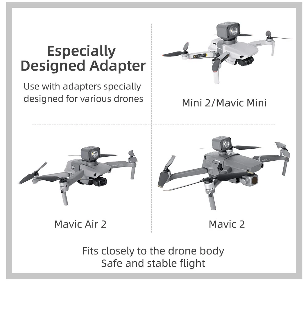 -Can be used with adapter mount of Mini /2/SE . Escort your drone at night flight.-3 kinds of brightness adjustable for different situations.-Weight only 44g, and no burden on the drone and do not affect flight.