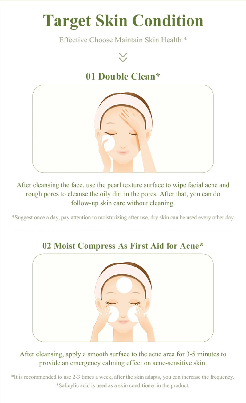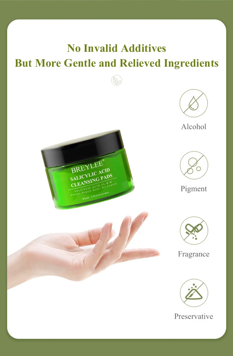 Название продукта: Чистящая салфетка с салициловой кислотойТехнические характеристики: 40 колодокЭффект: содержит 2% салициловую кислоту, Проникая глубоко в поры и очищая излишки омертвевших клеток кожи. Он растворит масло, Очистит поры, удалит черные точки и предотвратит появление акне. Двусторонний дизайн хлопковой простыни можно наносить и протирать, что удобно, освежает и не липнет, оставляя при этом кожу красивой и блестящей.Срок годности: 3 годаВнимание: 1. В случае чувствительной кожи, пожалуйста, сначала проверьте продукт на внутренней стороне руки. При возникновении дискомфорта немедленно прекратите использование продукта и обратитесь за помощью к дерматологу. 2. Если продукт попал вам в глаза, немедленно промойте их пресной водой. Способ держать в прохладном и сухом месте вдали от прямых солнечных лучей. (Хранить в недоступном для детей месте).