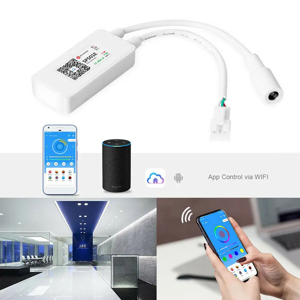 SP501E WIFI светодиодный контроллер Метод управления: APP-Wifi (поддержка Alexa) Входное напряжение: 5-24 В постоянного тока Пиксель: 900 Разъем: 3pin Расстояние управления: 20 м Вес изделия: 40 г; Размер изделия: 85 мм * 45 мм * 22 мм; Поддержка IC: WS2811 WS2812B WS2813 WS2815 WS2818 WS2801 SK6812 P943S P9411 SM16703 UCS1903 TM1804