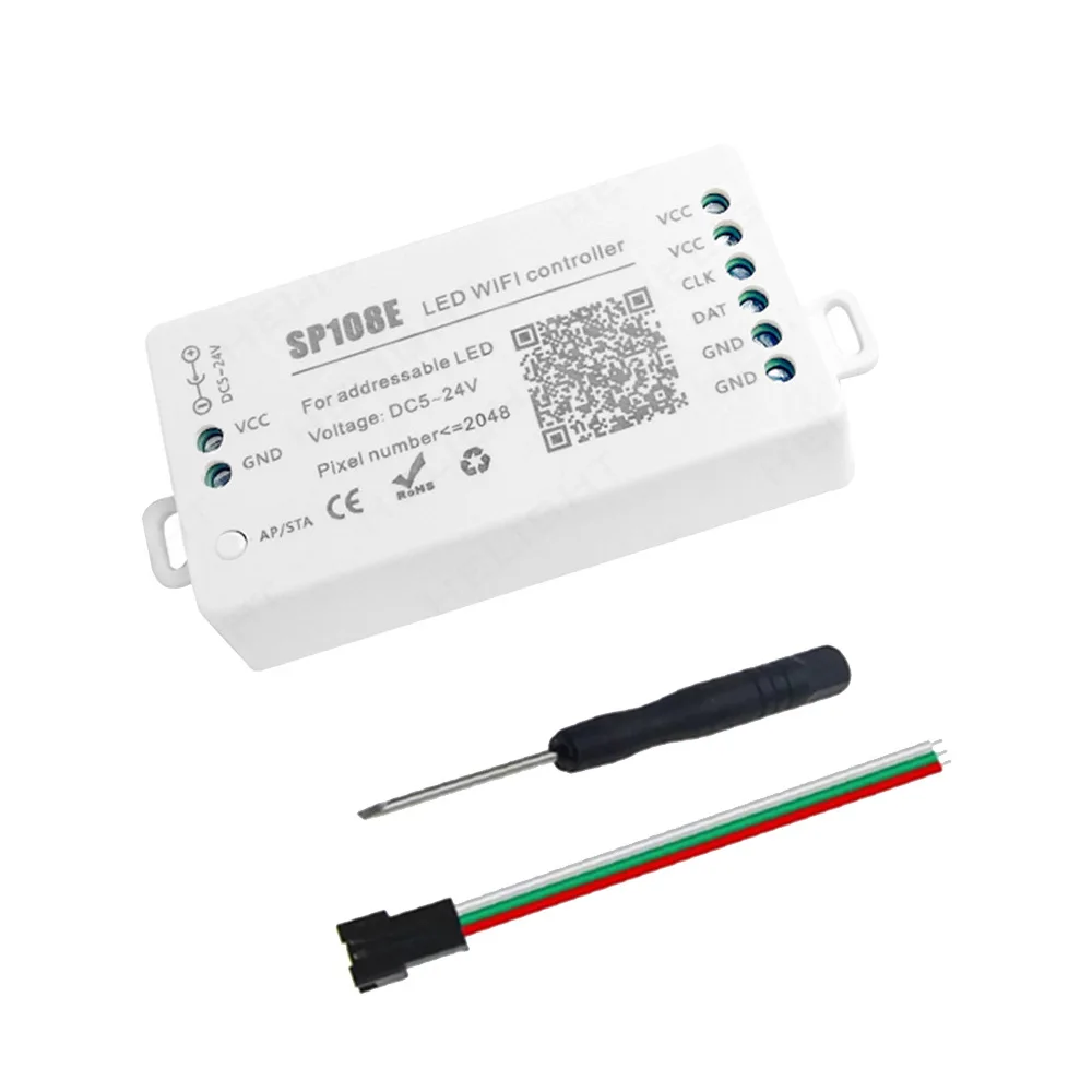 SP108E WIFI светодиодный контроллер Метод управления: APP-Wifi Входное напряжение: 5-24 В постоянного тока Пиксель: 2048 Разъем: 3pin/4pin Расстояние управления: 30 м Вес изделия: 40 г; Размер изделия: 85 мм * 45 мм * 22 мм; Поддержка IC: WS2811 WS2812B WS2813 WS2815 WS2818 WS2801 SK6812 P943S P9411 P9413 TX1812 TX1813 SK6812-RGBW SM16703 UCS1903 TM1804 LPD6803 LPD8806 a188806 a8206 a208gs12