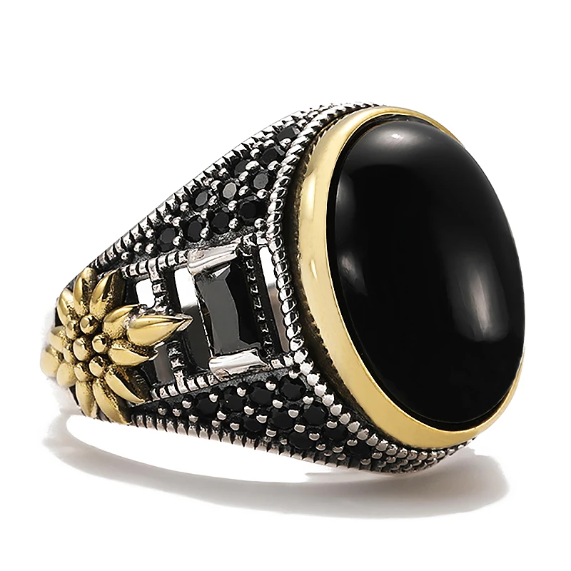 Классическое кольцо с черным овальным камнем для мужчин, ювелирные изделия в стиле панк, подарочное кольцо с текстурой цветка