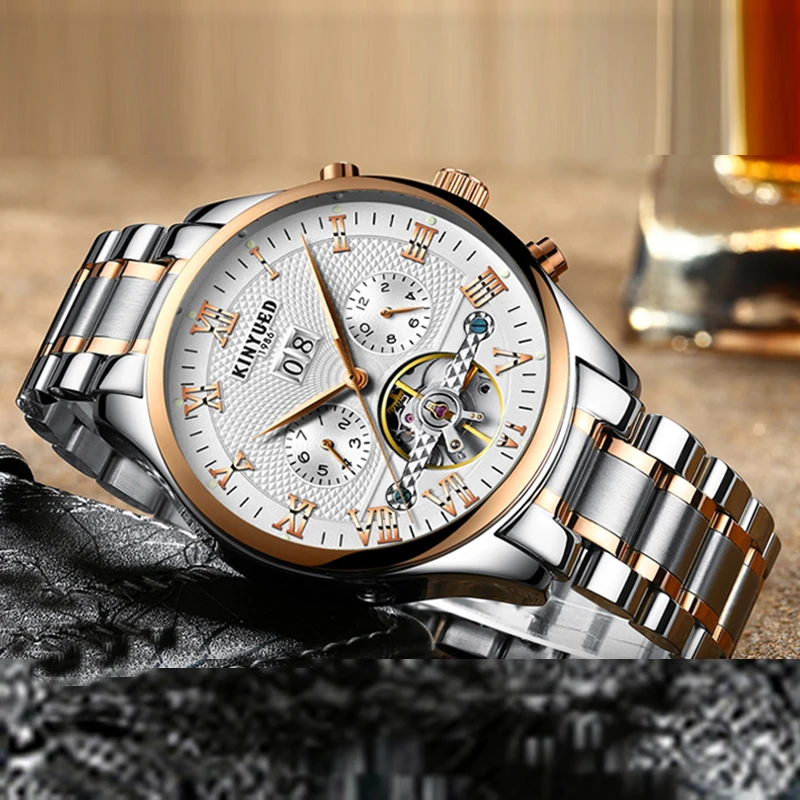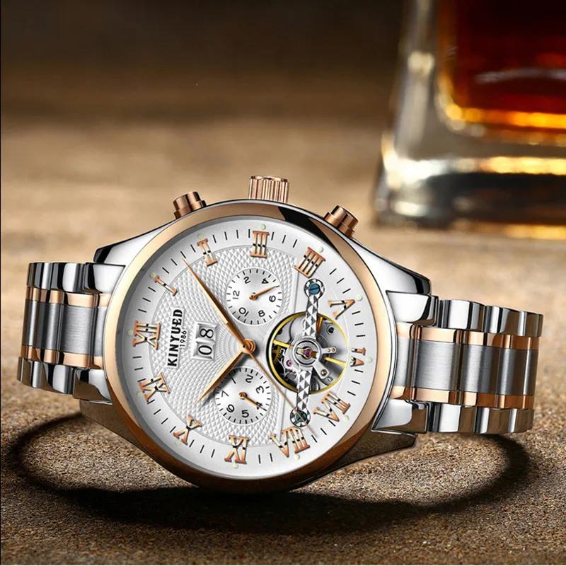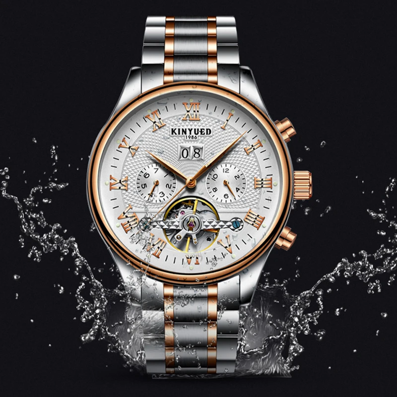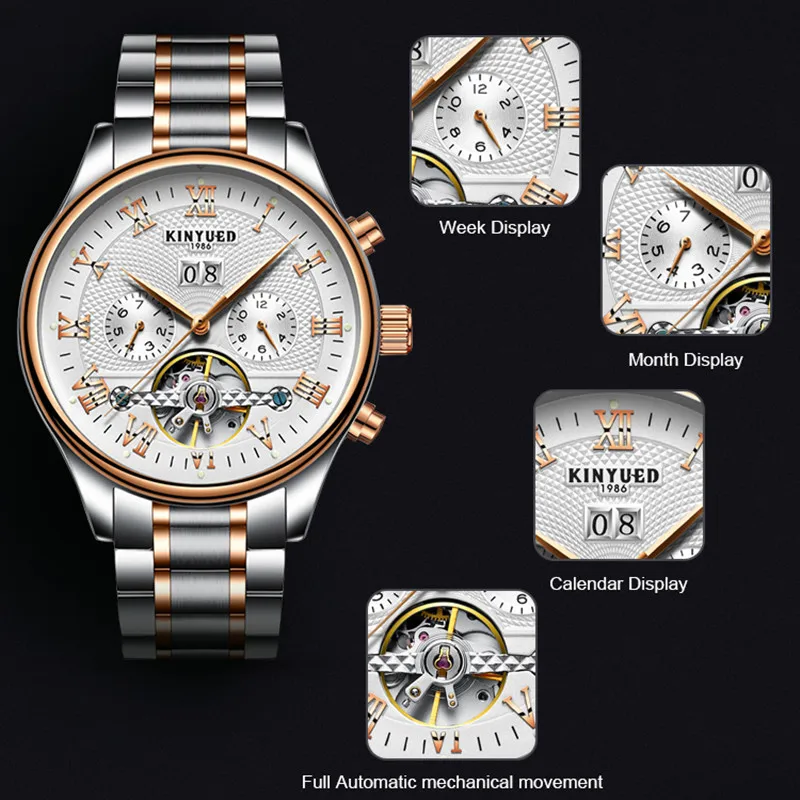 Часы-скелетоны KINYUED Мужские механические, автоматические водонепроницаемые Классические наручные, с календарем, отображением недели