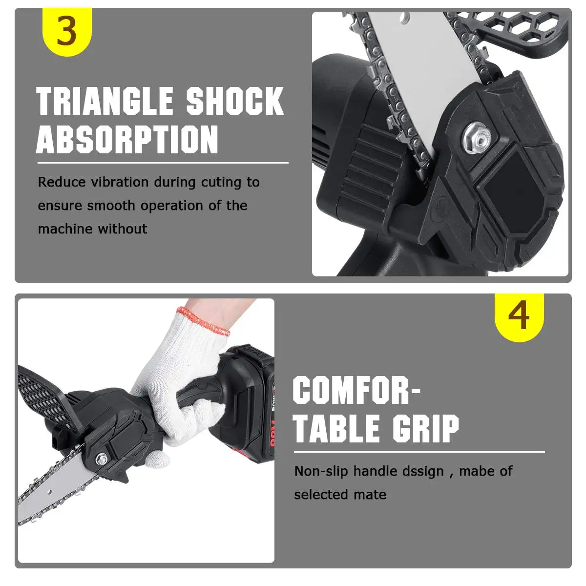 Особенности товара: Цвет: черныйНапряжение: 88 вМощность: 3000 ВтМатериал: АБС + стальДлина направляющей пластины: 4 дюймаСкорость цепи: 5 м/сЦепь: быстрая регулировкаБыстрая зарядка: 1,5 (3) часСкорость вращения: 10000р/минЕмкость аккумулятора: 10000 мАчКоличество аккумуляторов: 1/2Режущий Диаметр: 100 мм/3,9 ВРазмер корпуса: 12x33 см/4,7x13 дюймов