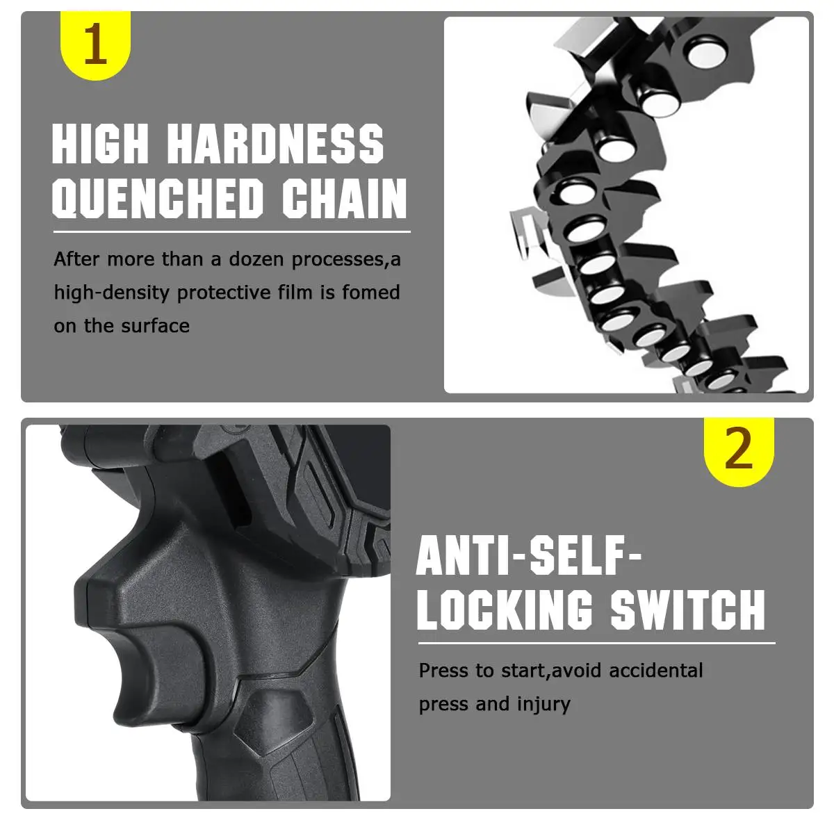 Особенности: -Аккумулятор с цифровым дисплеем, удобный.-С защитной перегородкой, предотвращает брызги опилок во время процесса резки.-Эргономичная ручка, которая очень удобна и безопасна для переноски.-Мощность литиевой батареи: Попрощайтесь с проблемой поиска источника питания.-Простота в использовании: Нет необходимости разбирать, поверните винт, чтобы отрегулировать герметичность цепи.-Эффективное рассеивание тепла: конструкция нескольких выпускных выходов на фюзеляже может эффективно предотвратить горение.-Безопасность пилы, эффективно повышает эффективность вашей работы.-Цепи пилы закаливают, закаляют и отжигают. Они долговечны, чем обычные цепи пилы.-Светильник вес тела, светильник и удобный, светильник вес конструкции, долгое время хранения и не устают руки.-Двигатель из чистой меди, сильная мощность, быстрая резка, повышение эффективности.-Практичная, быстрая скорость, низкое энергопотребление.-Переключатель отличного качества, быстрая и медленная регулировка, плавное изменение скорости.-Для вырубки и обрезки древесины.-Идеальный инструмент для вырубки отвечает различным потребностям многих ситуаций.