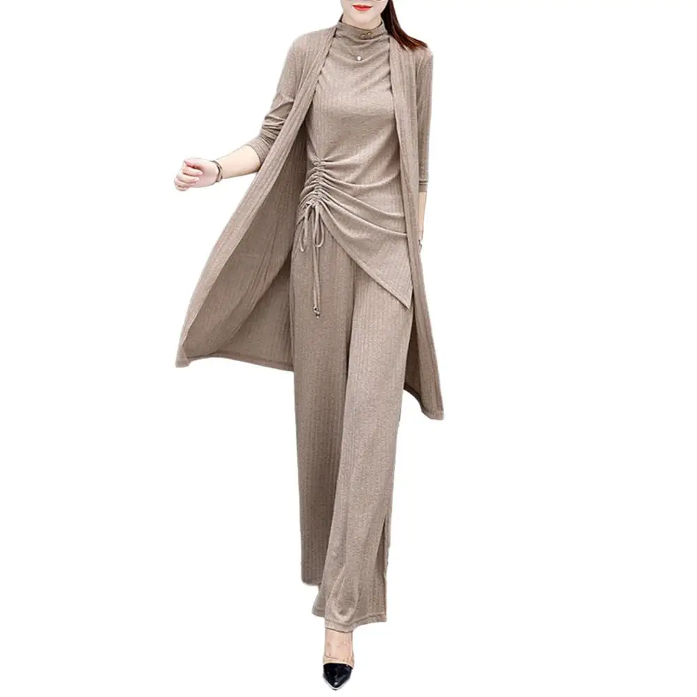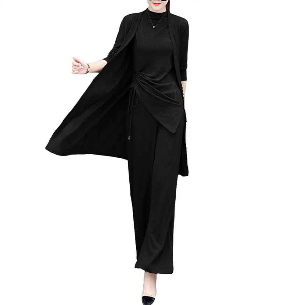 Комплект из трех предметов, однотонный свободный Женский вязаный Топ с боковыми завязками, брюки, Кардиган с длинным рукавом, комплект