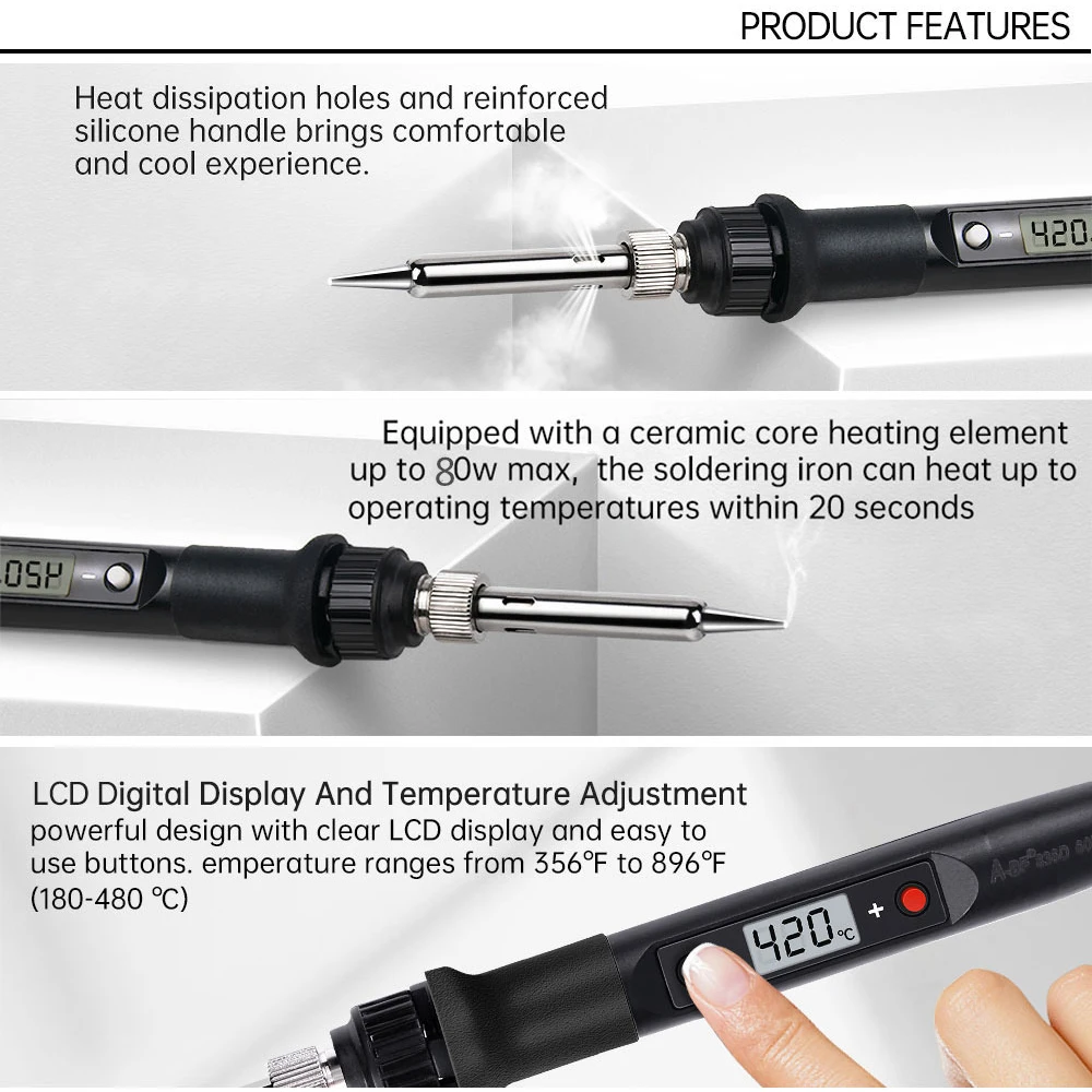 Этот паяльник представляет собой паяльный инструмент мощностью 80 Вт, который может работать при 200-450 градусах Цельсия. Температуру можно отрегулировать на 180-500 градусов по Цельсию.