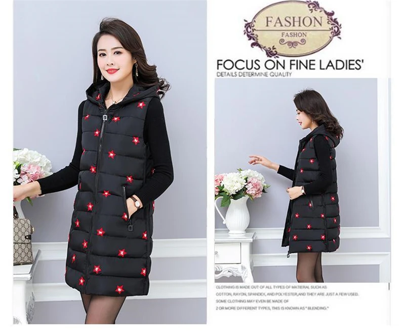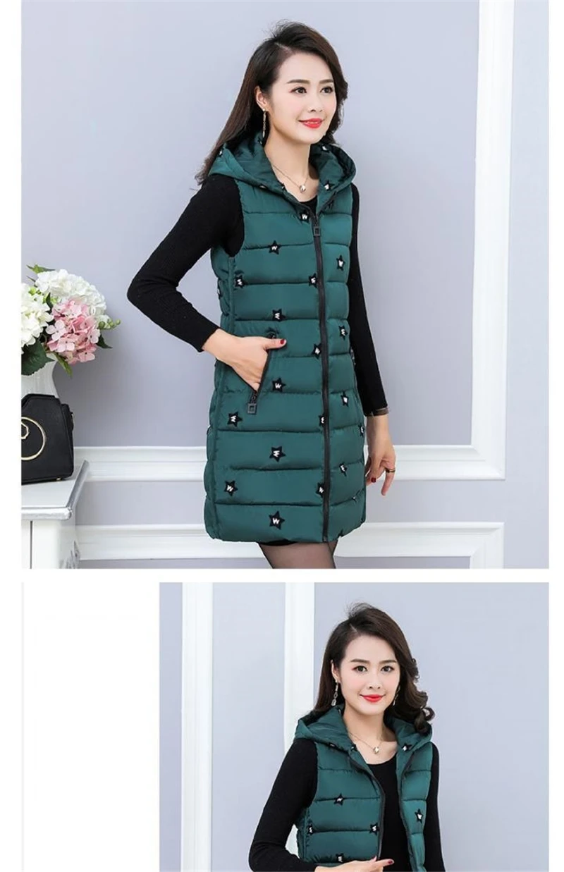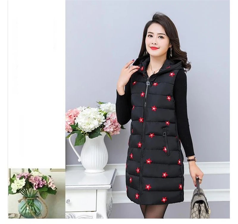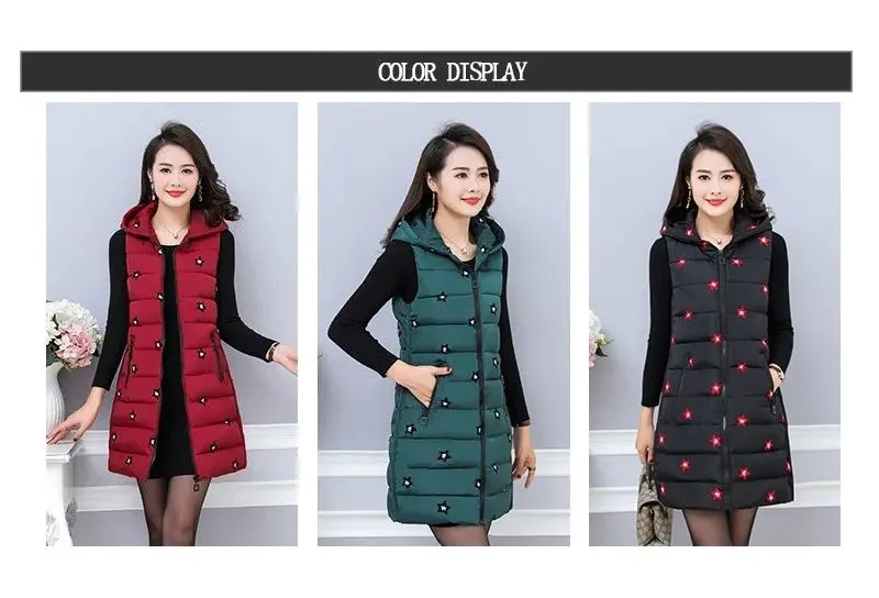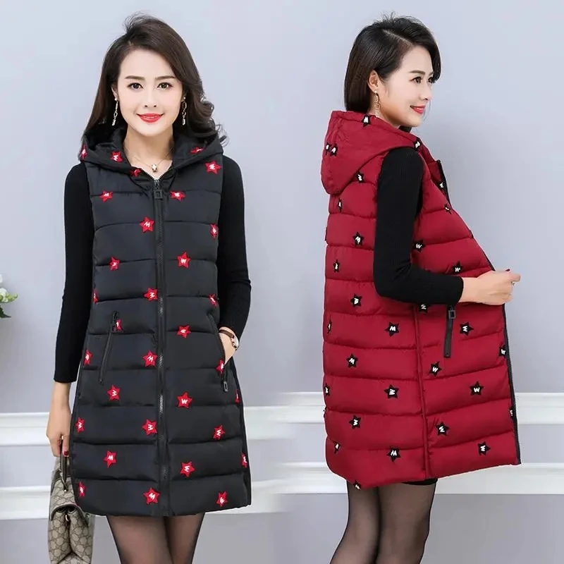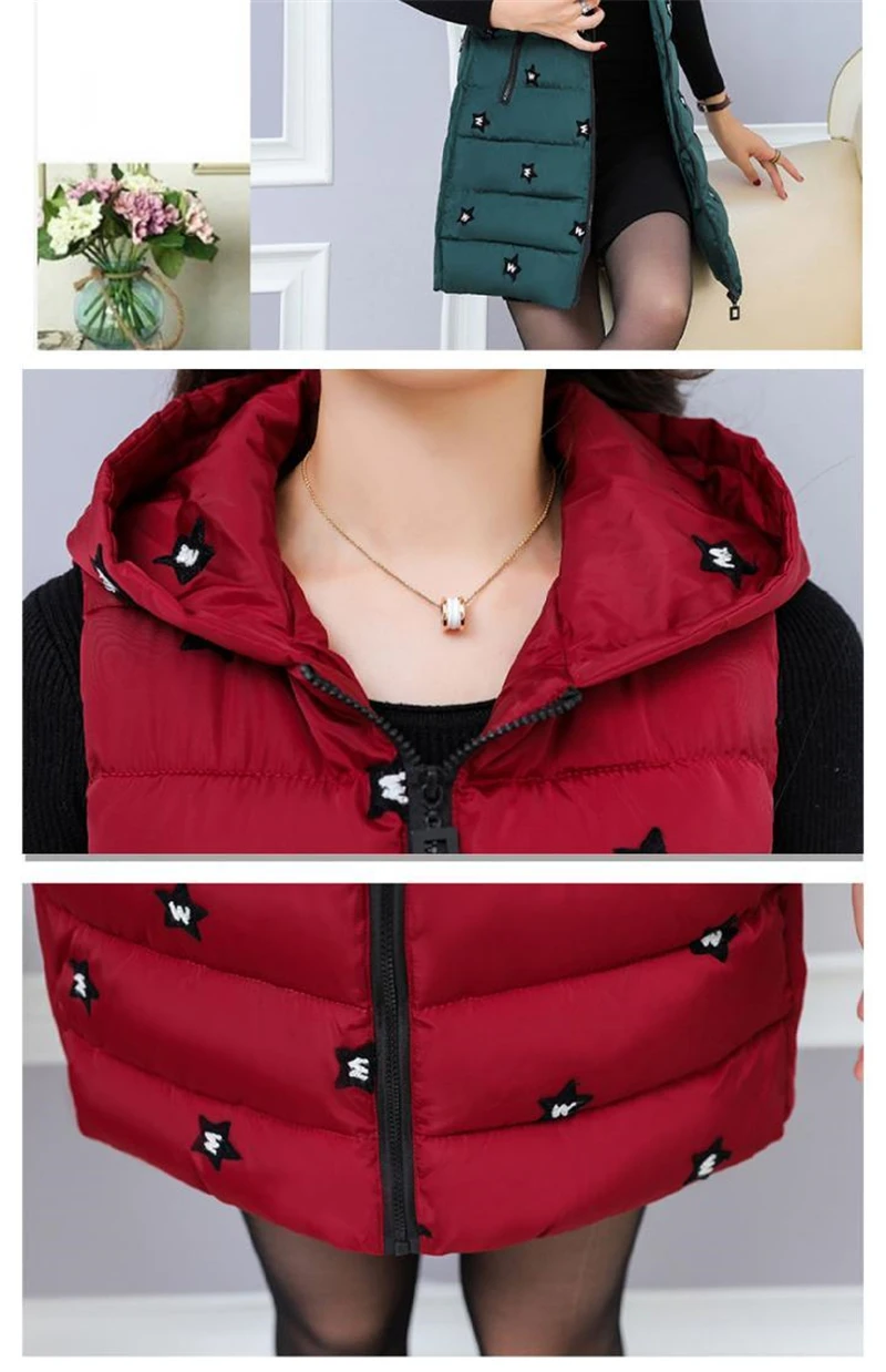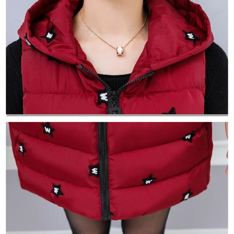 Осень-зима 2021, куртка с капюшоном, женский жилет, теплый жилет без рукавов, хлопковая куртка с вышивкой в виде звезд, Женская ватная верхняя одежда