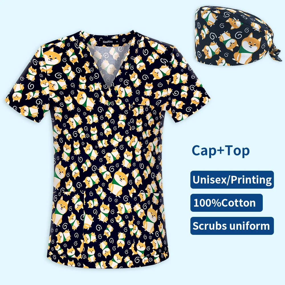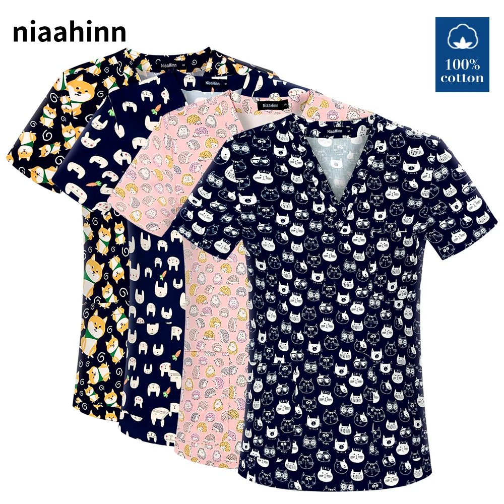 Униформа медсестры из 100% хлопка с короткими рукавами и принтом, унисекс, для клиники, ветеринарии, рабочие скрабы, топы, оптовая продажа, S-XXL