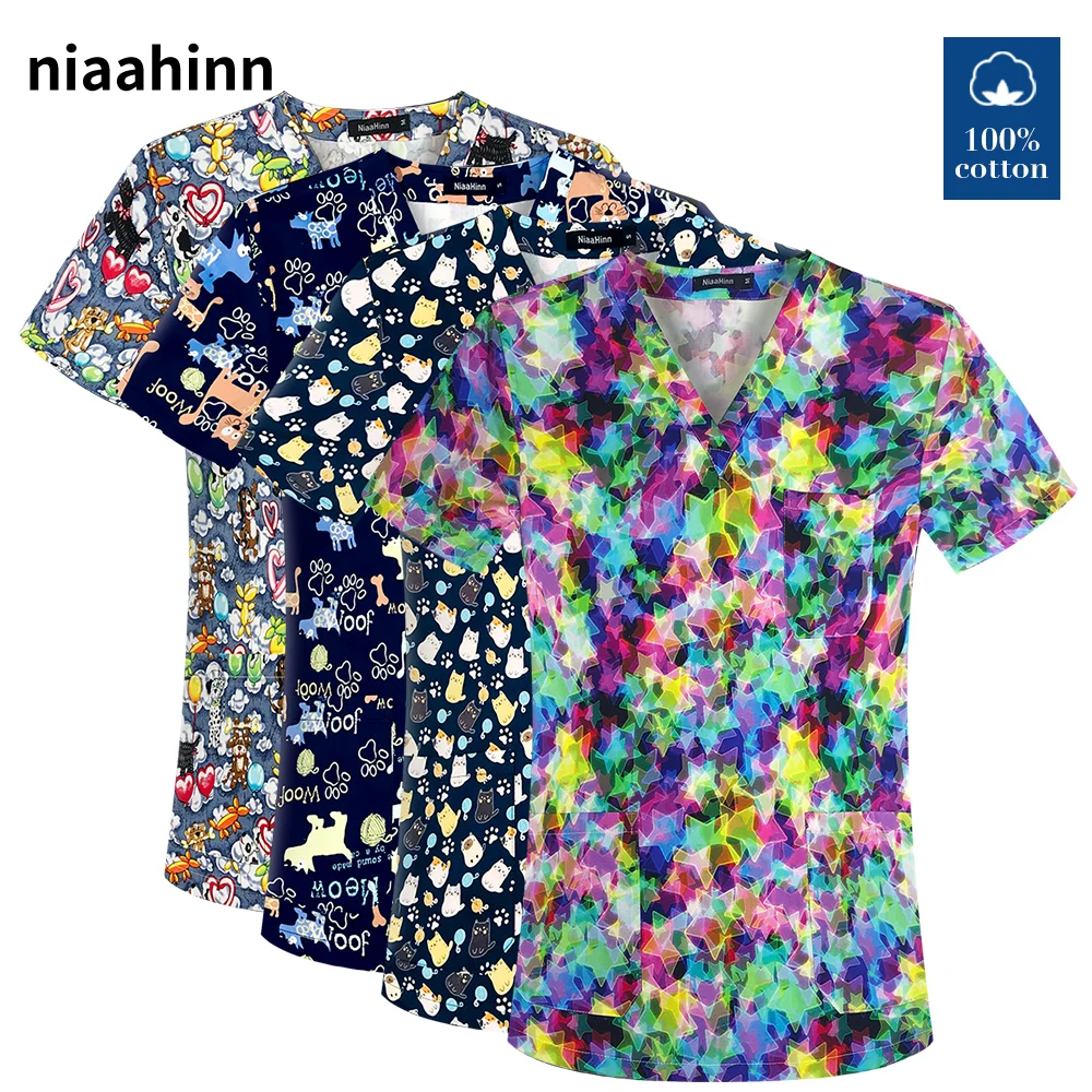 Scrubs tops Cute Cartoon printing Kindergarten teacher workwear pet...