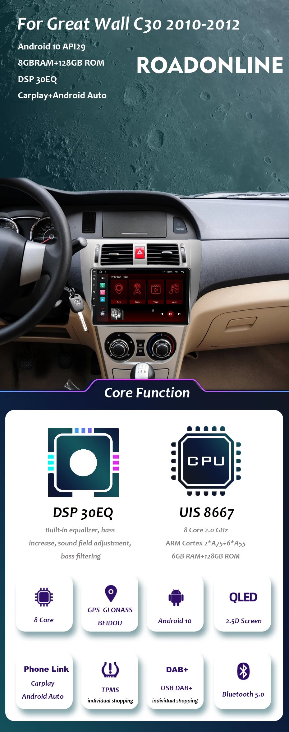 Roadonlie Android 10 для Great Wall Voleex C30 2010-2012 автомобильное радио, мультимедийный видеоплеер, GPS-навигация Carplay BT WIFI 4G