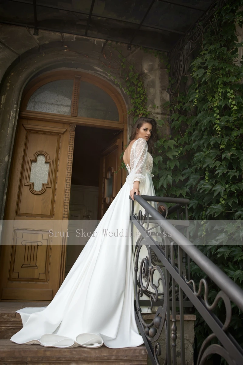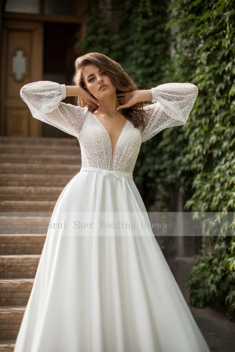Роскошное Свадебное платье с длинным пышным рукавом, V-образным вырезом, а-силуэт, жемчужинами, элегантные свадебные платья 2021, свадебное платье с открытой спиной и шлейфом, изготовление на заказ