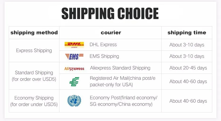 Способ доставки:Уважаемый Фрид, здесь показаны некоторые способы доставки и их время доставки. Вы можете проверить его и в соответствии с вашими требованиями, выберите способ доставки.
