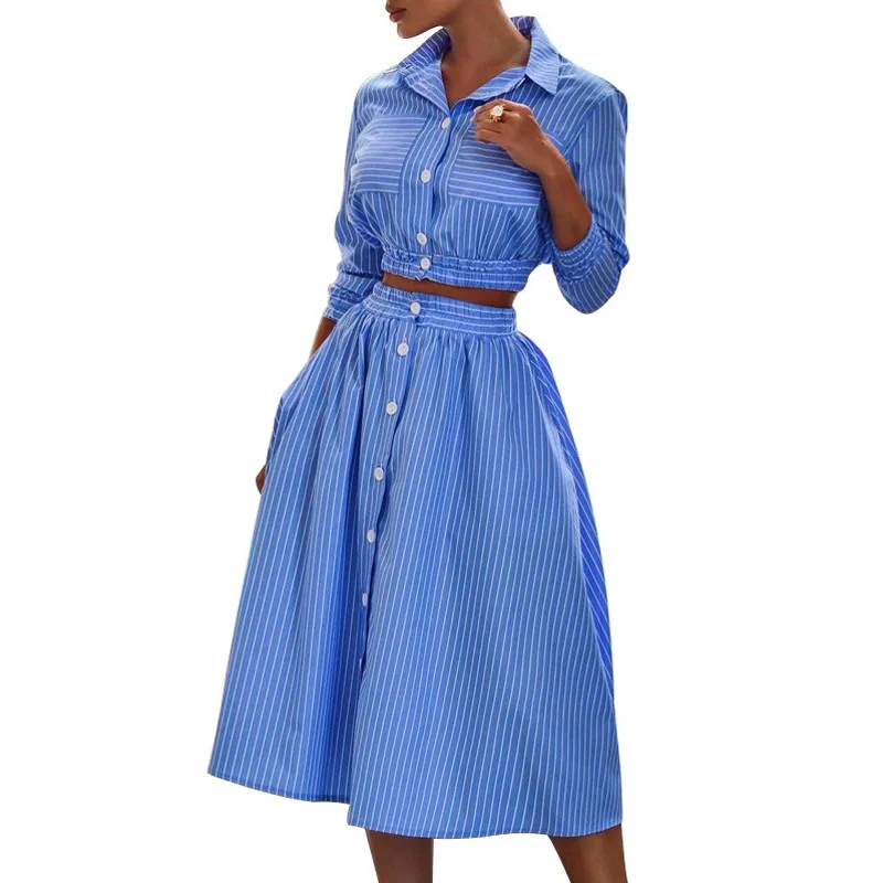 Женский комплект из 2 предметов, сексуальный осенний Модный женский комплект 2021, женские топы, рубашка с длинным рукавом и принтом в полоску, юбка миди с эластичным поясом, комплекты