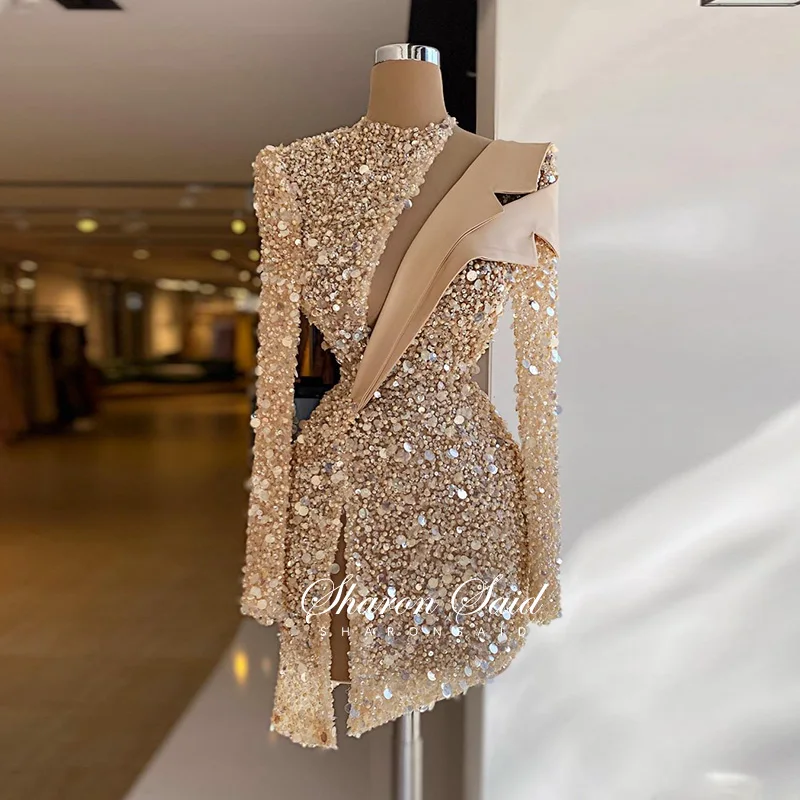 Роскошные Короткие Коктейльные Вечерние цвета шампанского с бисером, женское вечернее платье Дубая с длинным рукавом для выпускного вечера 2021
