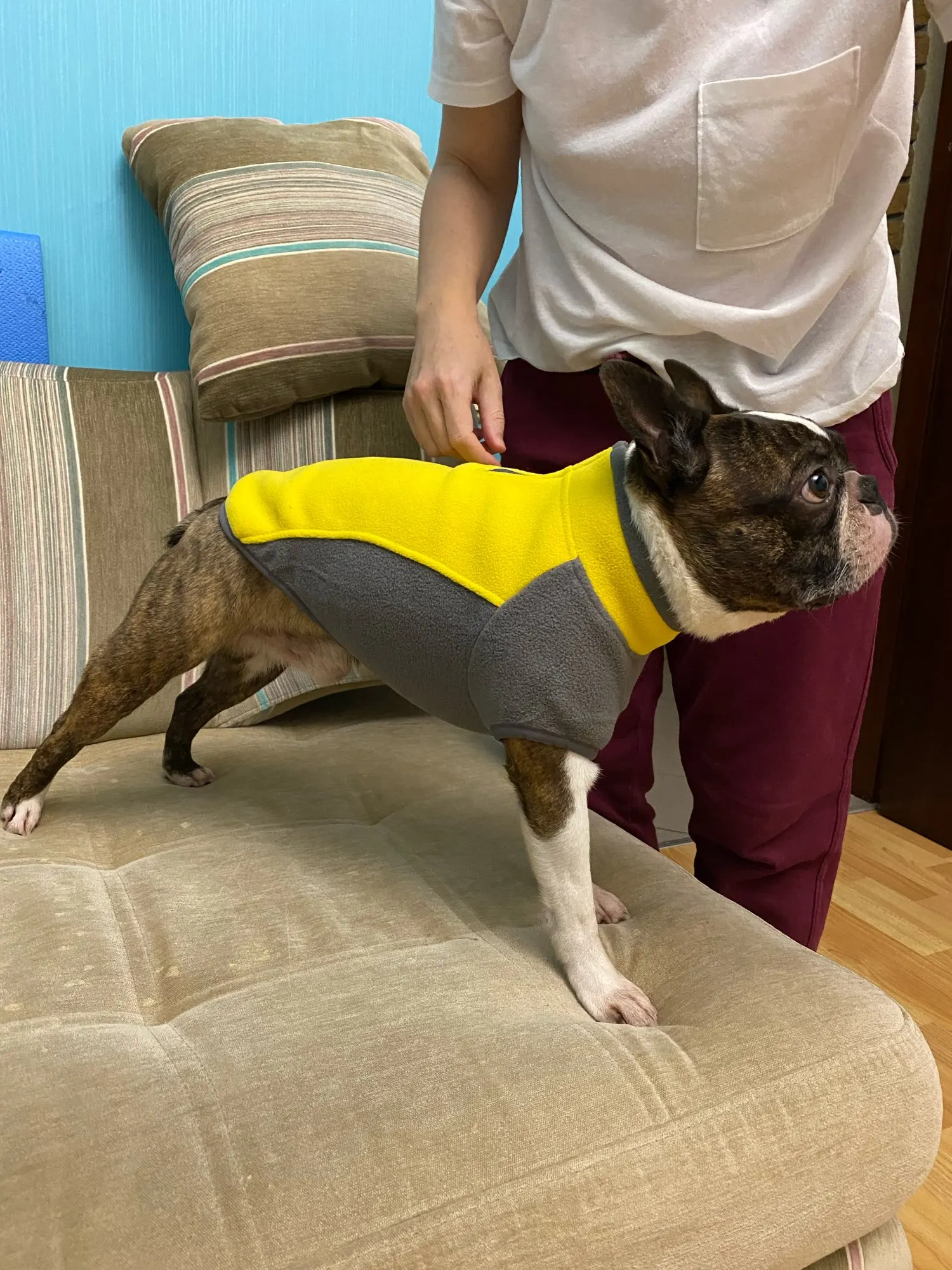 Очень хорошее качество. Для стандартной таксы весом 9,5 кг хорошо в груди, но коротко по длине. Размер M.