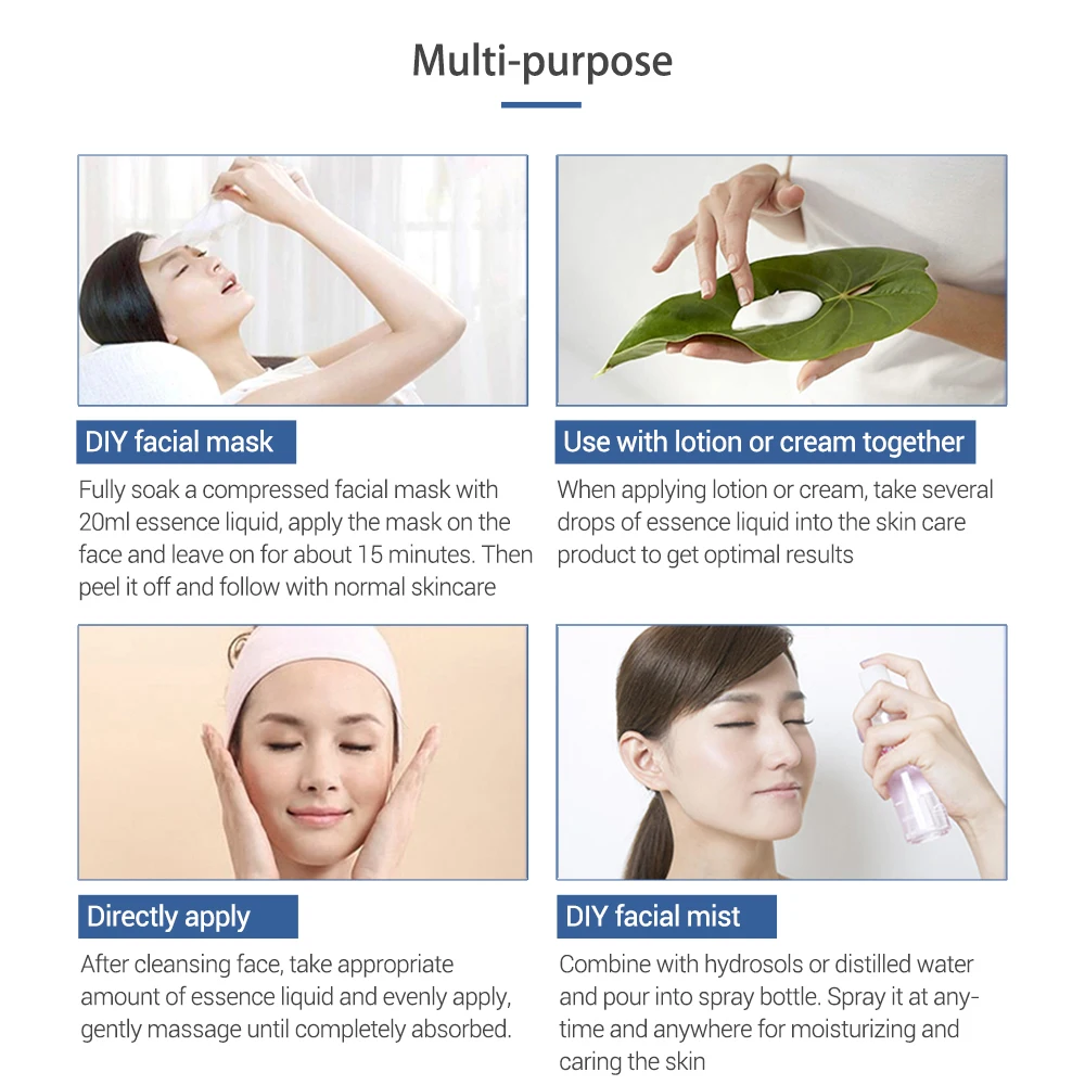 Маска для лица DIYПолностью Замочите сжатую маску для лица с жидкостью эссенции 20 мл, нанесите маску на лицо и оставьте на около 15 минут. Затем снимите ее и следуйте обычным правилам по уходу за кожей.Используйте вместе с лосьоном или кремомПри нанесении лосьона или крема, возьмите несколько капель эссенции жидкости в продукт по уходу за кожей, чтобы получить оптимальные результатыНепосредственно применяетсяПосле очищения лица принимайте необходимое количество жидкой эссенции и равномерно наносите, мягко массируйте до полного впитывания.Сделай Сам туман для лицаКомбинируйте с гидросолями или дистиллированной водой и залейте в распылительную бутылку. Распылите его в любое время и в любом месте для увлажнения и ухода за кожей
