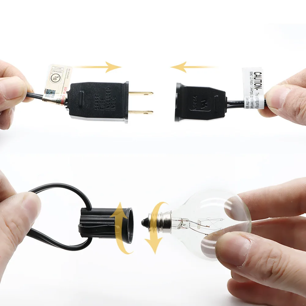 Примечание: Мы отправляем 2 дополнительных лампы на каждый светильник, всего 27 ламп! Информация о продукте Название продукта: светильник G40 Размер изделия: 25 футов Состав материала: пластик, стекло, медная проволока Входное напряжение: 220 В переменного тока/110 В переменного тока Однострунный светильник мощность нагрузки: 175 Вт Максимальная мощность нагрузки: 432 Вт (2 акции) Тип основания: E12 Водонепроницаемость: IP65 Тип лампы: G40 Количество ламп: 25 шт. + 2 запасных лампы Срок службы лампы: 2500 часов Цветовая температура: 2100-2200k Общая длина: 7,62 метров/25 футов/светильник интервал: 12 дюймов Вес изделия: 470 г/16,6 унций Размер упаковки: 23*23*9 см/9,1*9,1 * (* Ш * В L) 3,5 дюйма Вес посылка: 680 г/22,9 унций Модель лампы: E12 Медная головка, покрытая медью