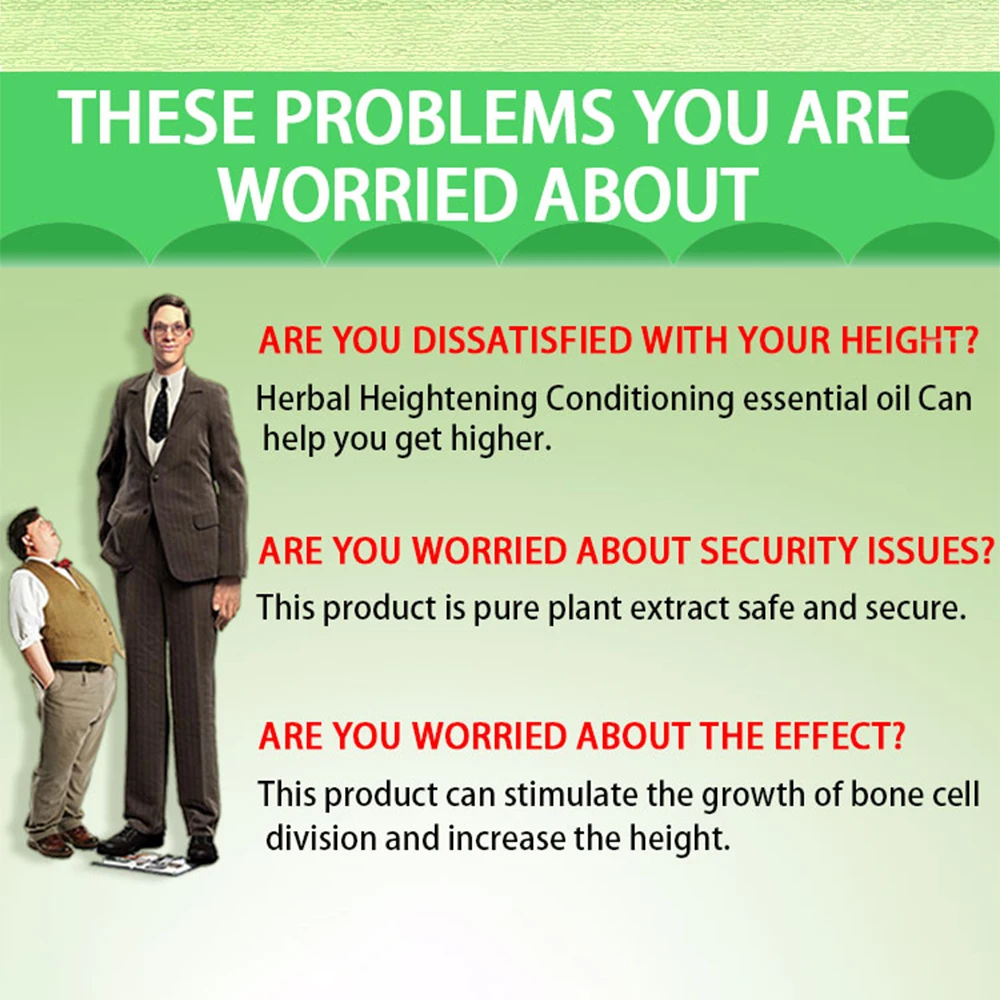 ▶Вы недовольны ростом?Травяное эфирное масло для кондиционирования может помочь вам получить больше.▶Вы беспокоитесь о проблемах безопасности?Этот продукт является чистым растительным экстрактом безопасным и безопасным.▶Вы беспокоитесь о эффекте?Этот продукт может стимулировать рост отдела костных клеток и увеличить рост.