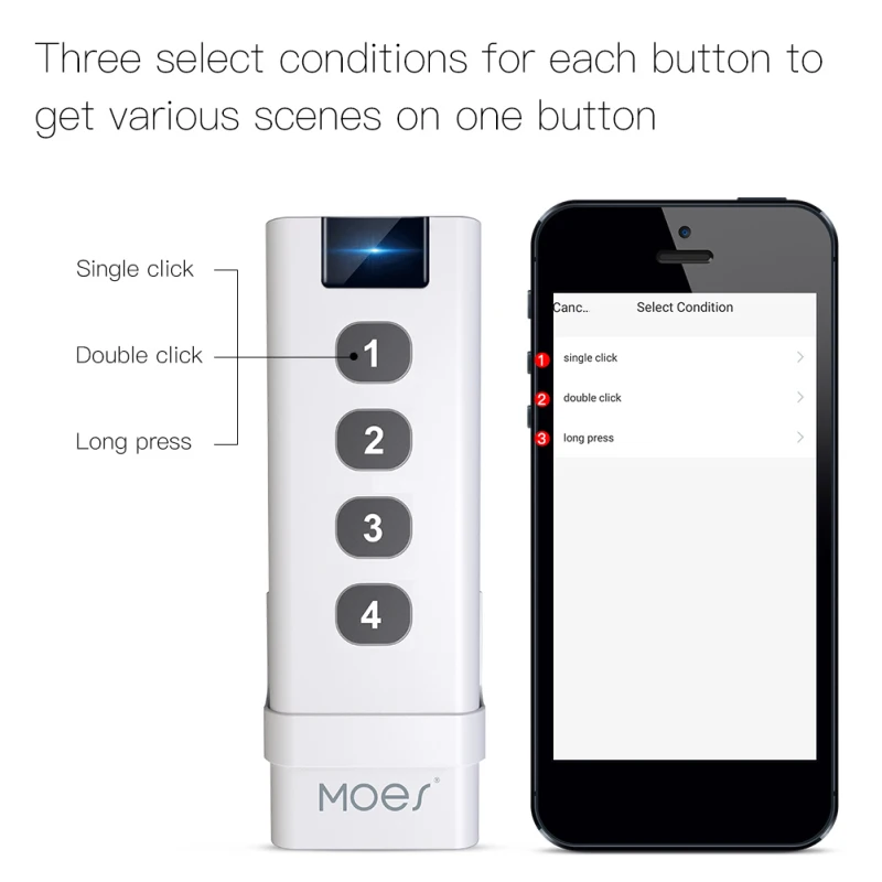 2. Три режима сопряжения для каждой кнопки для достижения 12 сцен с одного 4 пульта дистанционного управления, таких как режим вдали, домашний режим, режим кино в каждой кнопке и т. Д. Для создания любой умной автоматизации, как вы Хотите, чтобы в вашем смартфоне был запущен другой Интеллектуальный образ жизни, больше нет голосовой команды, больше нет времени, чтобы открыть приложение, требуется только одно касание, когда вы устали от одного дня Работа.