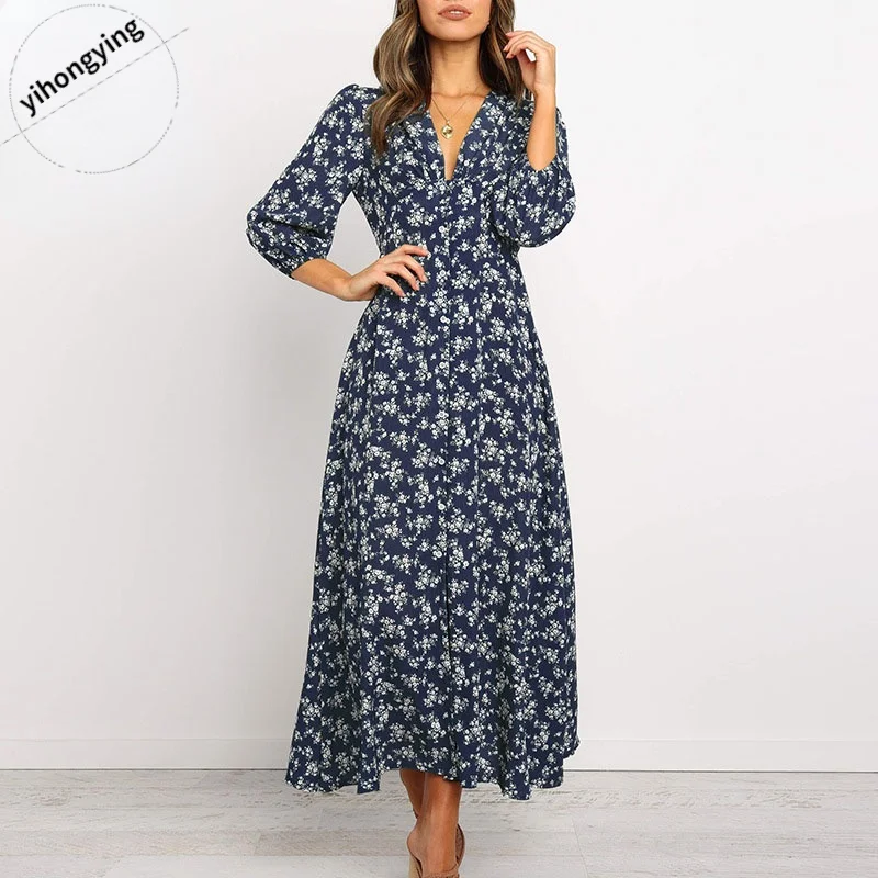 Осеннее длинное платье с цветочным принтом, женская одежда с V-обра...