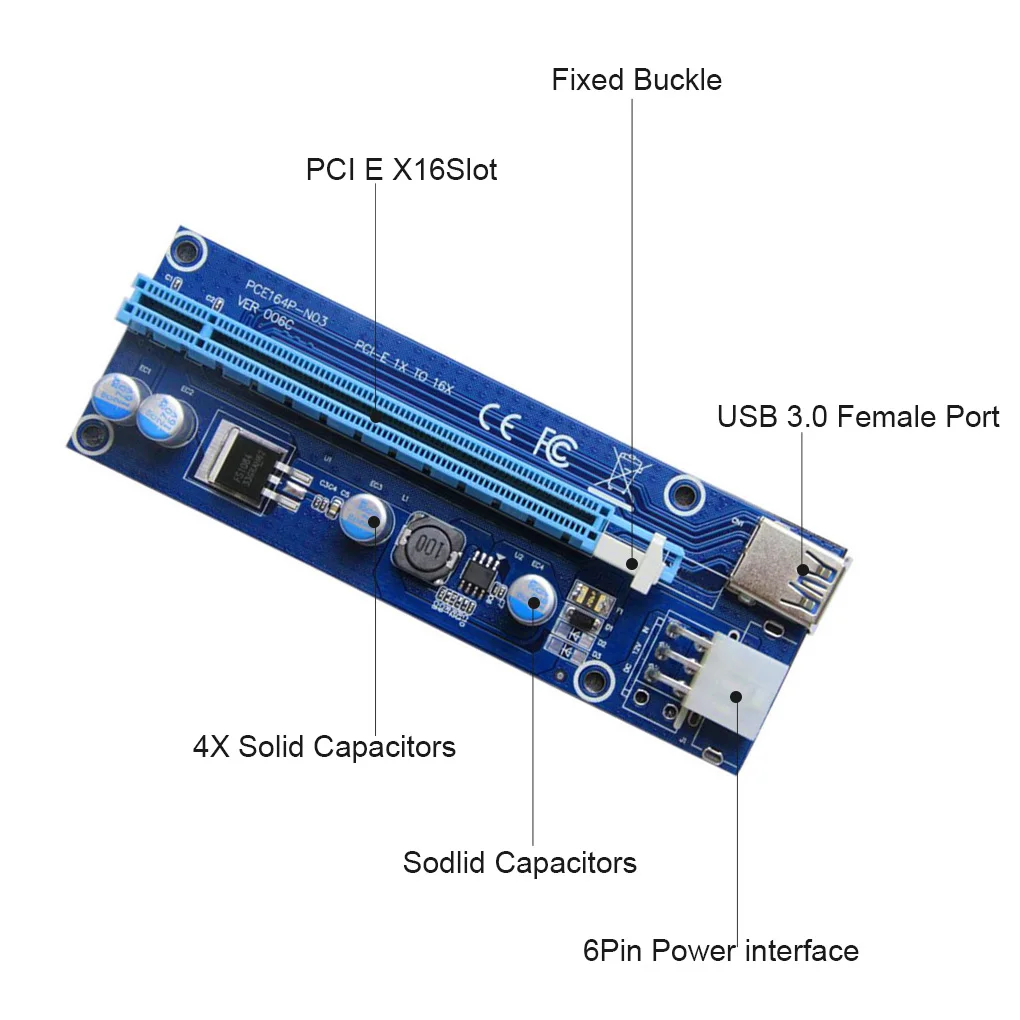 Переходник VER006C 1x на 16x PCI Express PCIE PCI-E Riser Card 006C 009s Molex 6Pin на SATA 1X 16X USB3.0 светодиодный шт.