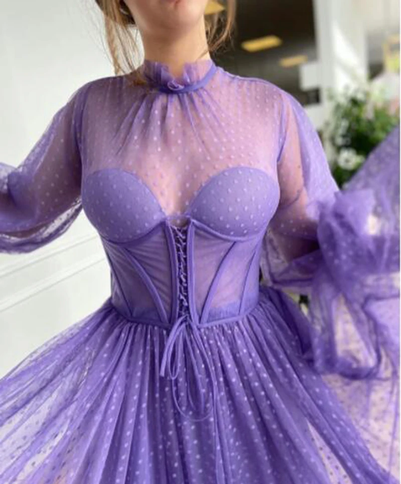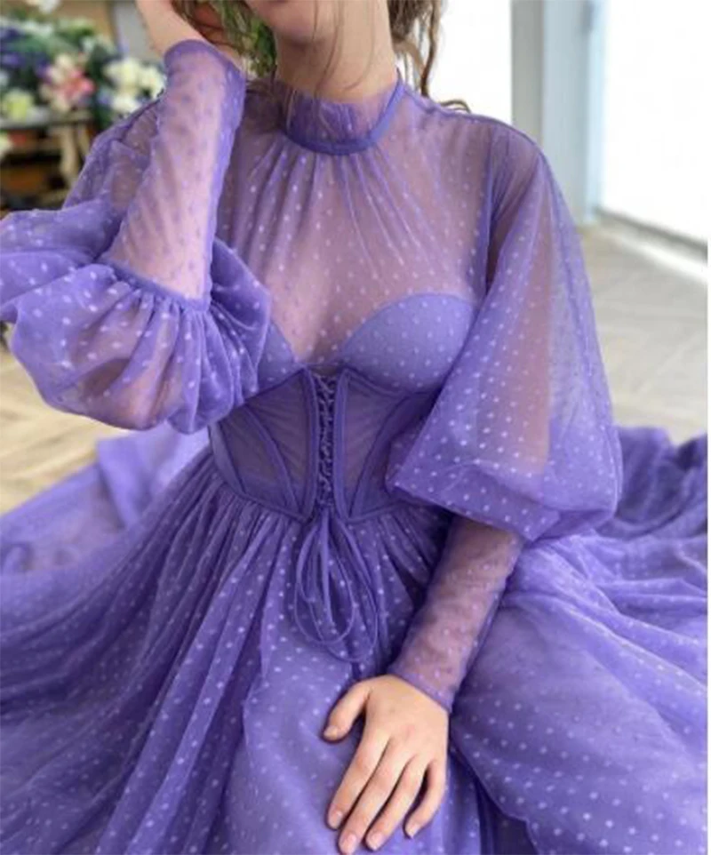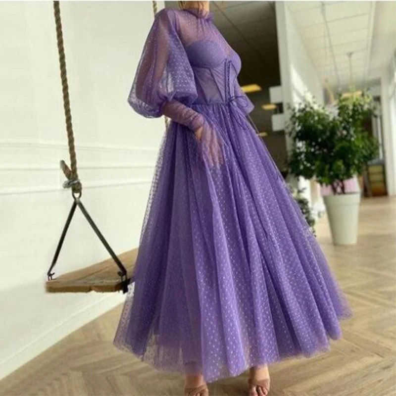 Платье для выпускного вечера из тюля, с круглым вырезом и длинными рукавами-фонариками