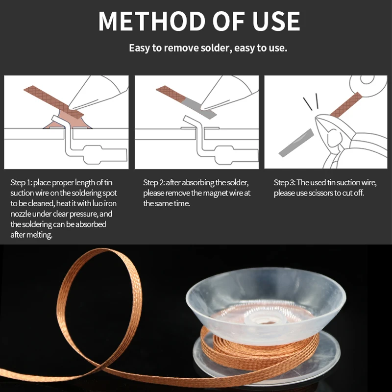 Характеристика: Высокая эффективность и экономит время электроремонта. Избегайте высокой температуры уничтожения электрической прокладки. Конструкция в точности, гарантирует максимальное поверхностное натяжение и способность поглощения олова. Ускорьте скорость поглощения олова и низкого остатка потока. Увеличьте скорость очистки печатной платы. Стойкость к окислению и защита от коррозии, хорошая теплопроводность. Спецификация: Длина: 1,5 м Ширина: 1 мм/1,5 мм/2 мм/2,5 мм/3 мм/3,5 мм/4 мм Материал: чистая медь