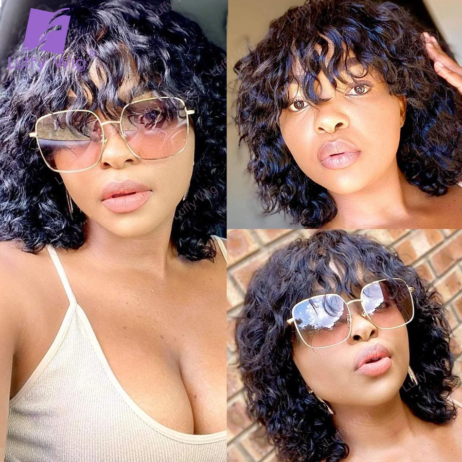 Короткие кудрявые парики боб с челкой для чернокожих женщин, бразильские человеческие волосы Реми, машинная обработка головы, верхний парик без клея, плотность 200