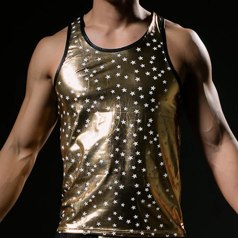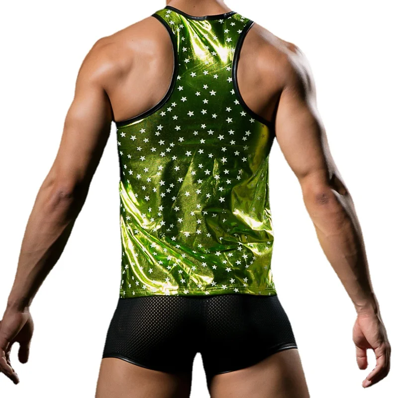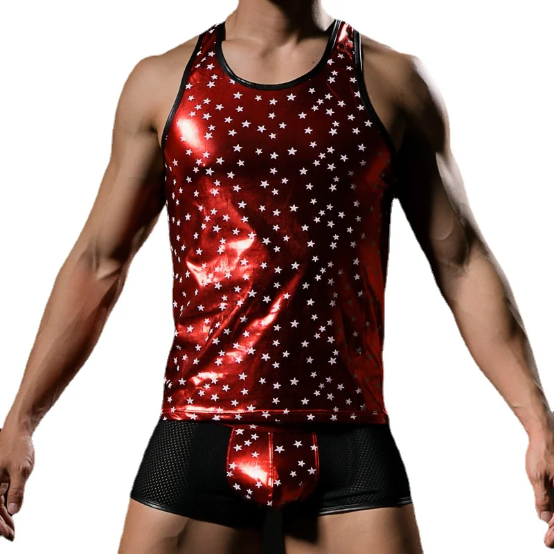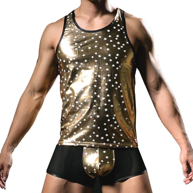 Майка мужская из искусственной кожи, пикантный жилет с блестящими звездами, без рукавов, боди для геев, Комплект трусов и боксеров, забавный жилет для вечерние
