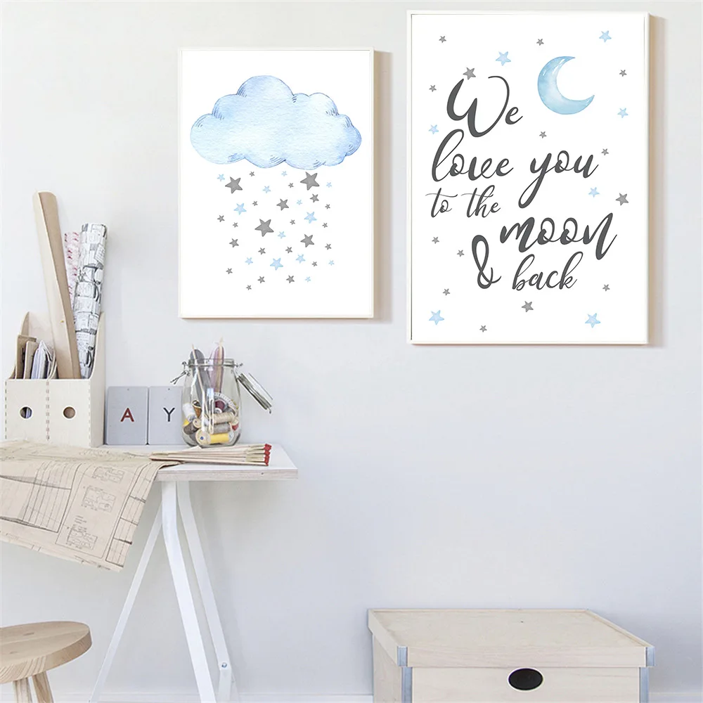 Детская Картина на холсте, Постер с голубой луной, облаком, звездами, цитатами, скандинавские настенные картины для декора детской комнаты