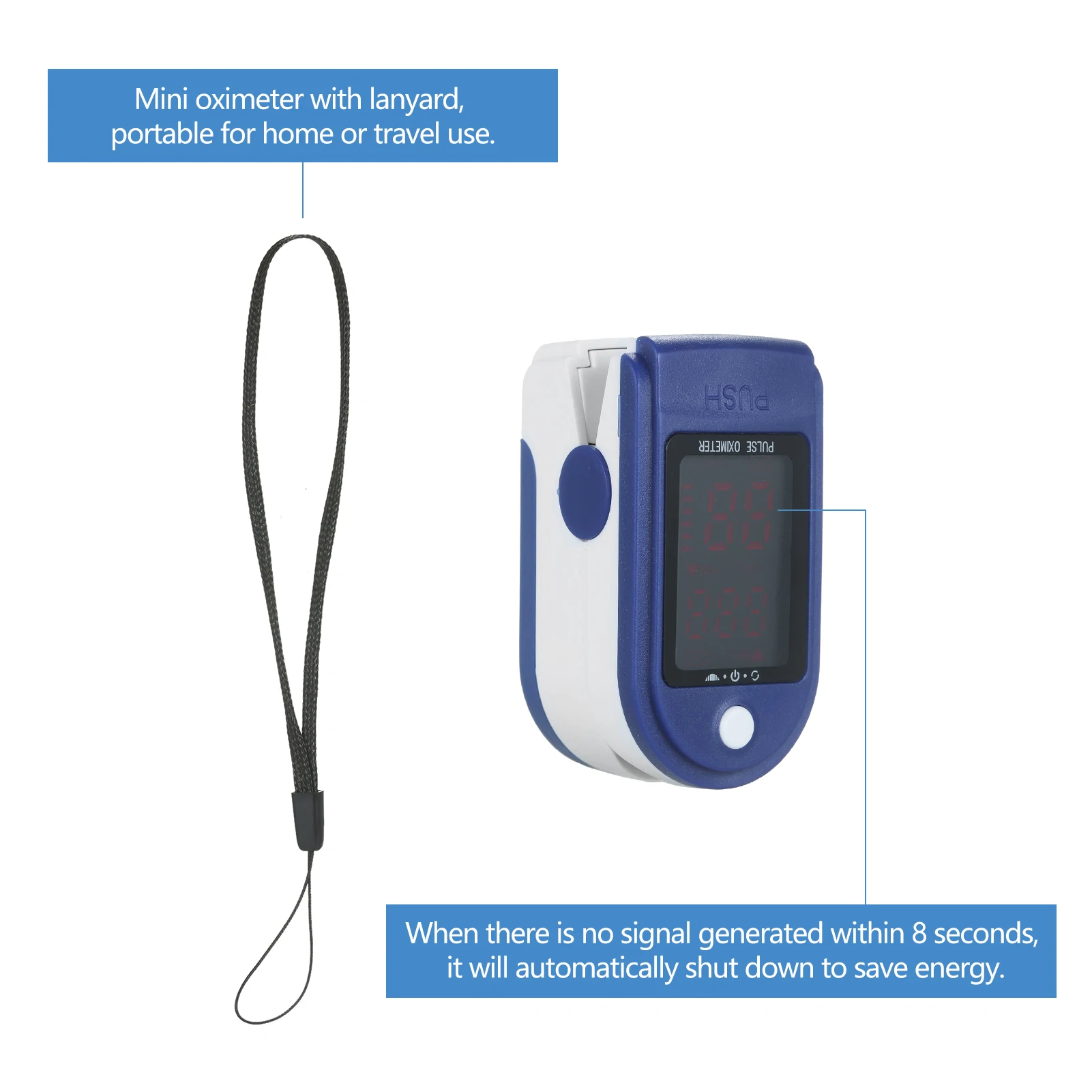 Этот компактный Пульсоксиметр может использоваться для измерения насыщения крови кислородом и частоты пульса, быстро Вставляя Один палец полностью в измерительные части оксиметра, подходит для семейного и личного ухода в ежедневном использовании.Особенности:Небольшой размер и легкий вес, компактный и портативный для использования и переноски.Прозрачный монохромный СВЕТОДИОДНЫЙ дисплей HD, выберите по желанию.Поддержка 4 переключаемых направления дисплея (вверх, вниз, влево и вправо) для удобного чтения, удовлетворения ваших различных потребностей.Зажмите один палец оксиметром, и с помощью одной кнопки он быстро и точно измерит SpO2 (насыщение крови кислородом) и PR (пульс).Когда сигнал не генерируется в течение 8 секунд, он автоматически отключится для экономии энергии.Мини-оксиметр с ремешком, портативный для дома или путешествий.Характеристики:Материал: АБС + электронные компонентыЦвет: синийТип дисплея: монохромныйПитание: 2*1,5 V элемент питания AAА (в комплект не входит)Мощность: <30 мАSpO2:Диапазон измерения: 70% ~ 99%Точность: ± 2% на этапе 80% ~ 99%, ± 3% на этапе 70%-79%Разрешение: 1%PR:Диапазон измерения: 30 ~ 240BPMТочность: ± 1BPM или ± 1% (чем больше)Рабочая температура: 5 ℃ ~ 40 ℃Температура хранения: -10 ℃ ~ 55 ℃Автоматическое выключение: без вставки пальца в течение 8 секундРазмер изделия: прибл. 5,8*3,2*3,2 см/2,28*1,26 * 1.26inВес изделия: прибл. 26 г/0,92 унцийРазмер посылка: прибл. 7,7*5,5*3,6 см/3,03*2,17 * 1.42inВес посылка: прибл. 36 г/1,27 унцийУпаковочный лист:1 * оксиметр1 * ремешок1 * Руководство пользователя (на английском языке)