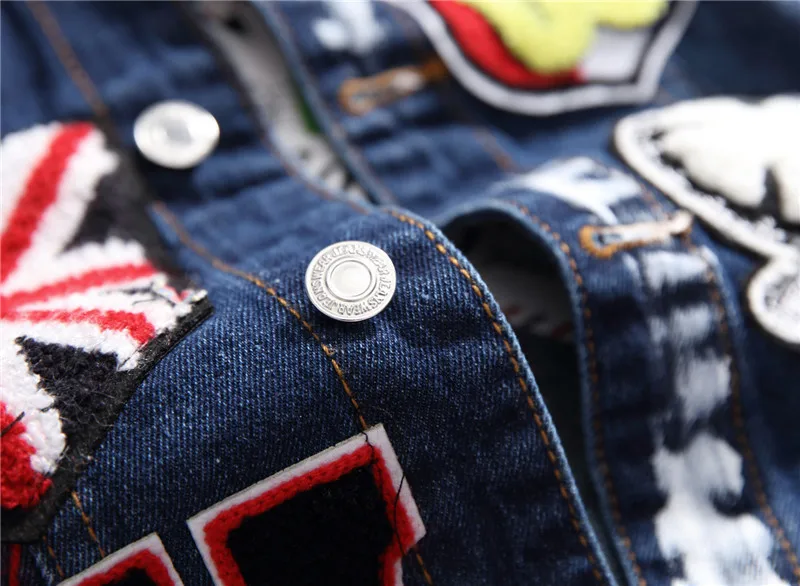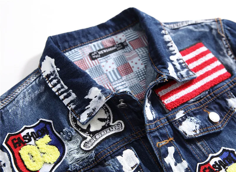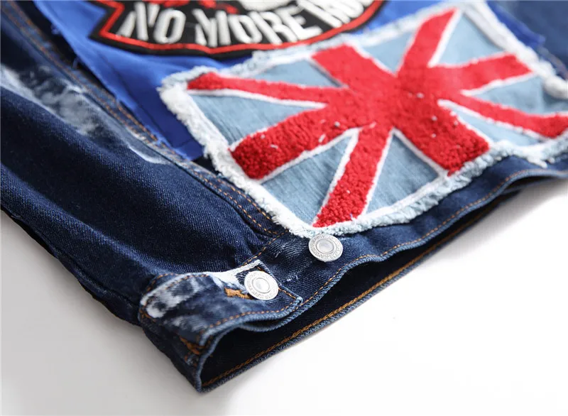 Мужская джинсовая куртка с нашивками в виде флага и надписей, Облег...