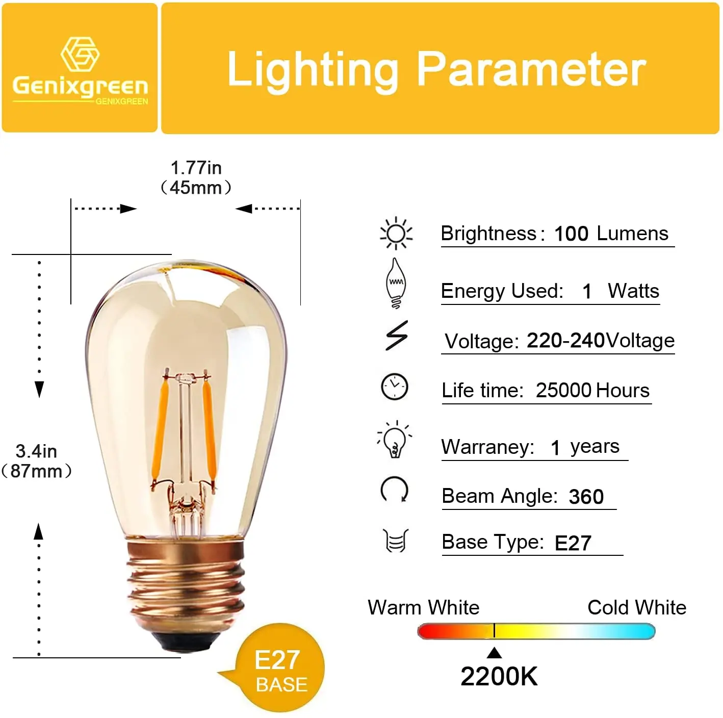 Винтажная Светодиодная лампа накаливания E27 1 Вт S14 Янтарное стекло ST45, диммируемая Светодиодная лампа теплого желтого цвета 2200K Светильник ПА накаливания для лампочесветильник накаливания