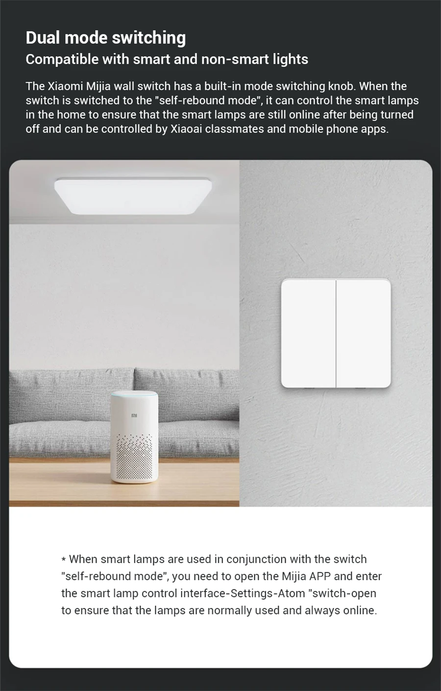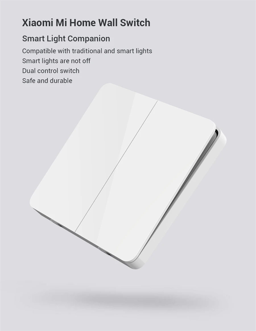 Настенный выключатель Xiaomi Mijia-это двойной переключатель управления. Можно использовать одиночное управление или двойное управление электрической цепи домашней проводки. Двойной переключатель управления может удовлетворить многопозиционное Управление лампой пользователя. Вы можете использовать различные переключатели для управления одной и той же лампой.