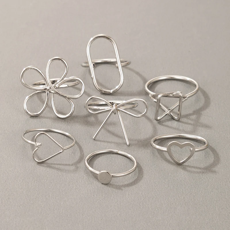 Элегантные кольца docona 7 шт.компл. в форме сердца и цветов для женщин, геометрические полые овальные банты, милый набор серебряных колец, Женские Ювелирные изделия 19717
