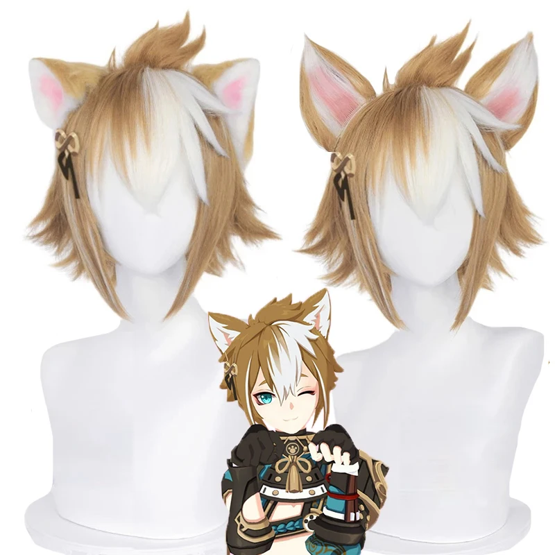 Парик для косплея Gorou, короткий, коричневый, белый, с ушками, из ...