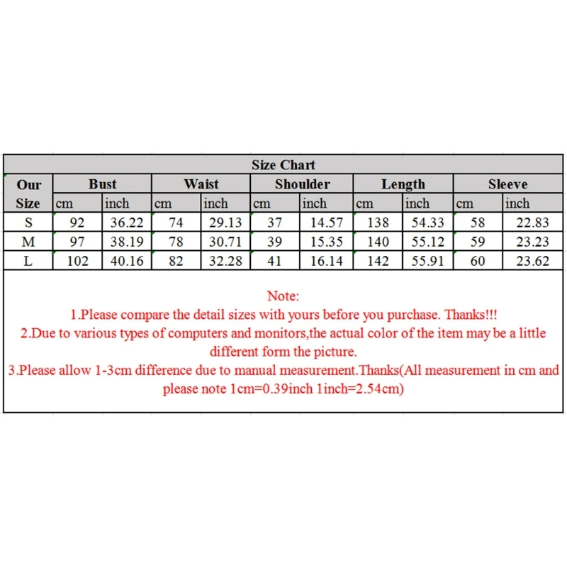 Размер: L Обхват груди: 102 см (40,15 дюйма) обхват талии: 82 см (32,28 дюйма) ширина плеч: 41 см (16,14 дюйма) Длина: 142 см (55,91 дюйма) рукав: 60 см (23,62 дюйма)