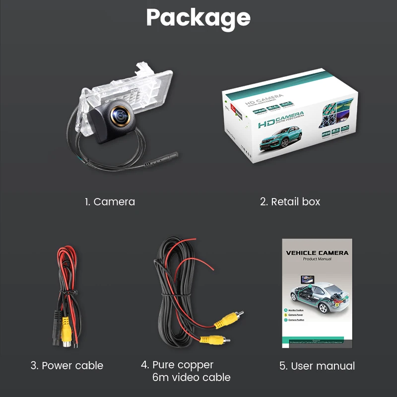 1. Камера заднего вида2. Розничная коробка3. Кабель питания4. Чистый медный 6 м видео кабель5. Руководство пользователя