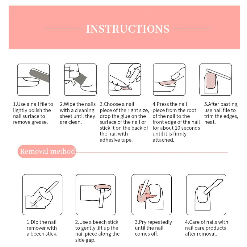 Характеристика: 1.100% Абсолютно Новый. 2. Для профессионального наращивания ногтей. 3. Идеальный выбор для вашей моды ногтей. 4. Простота в использовании, точное, идеальное украшение и долговечность. 5. Подходит для использования с гелем, акрилом или стекловолокном. 6. Различные размеры на ваш выбор, подходят для большинства людей. 7. Можно добавить украшения для ногтей на ногти и создать свой собственный стиль и узор. 8. Для профессионального салона или домашнего использования. Как использовать: 1. Отожмите стороны и область кутикулы для точной посадки с помощью маникюрной палочки; 2. Очистите ногти от любого польского масла с помощью ацетона для удаления лака; 3. Выберите правильный размер ногтей для каждого пальца; 4. Нанесите клей на ногти; 5. Нанесите тонкий слой клея на натуральные ногти; 6. Начиная с кутикулы, нажмите и удерживайте в течение 5 секунд; 7. Напиши и формируем новые ногти при необходимости. Удалите советы: Положите ногти в теплую воду в течение 2 минут, и стикер для ногтей может быть удален легче. Не удаляйте его резко, и это может нанести вред поверхности ногтей. Примечание: Ввиду того, что Замеры производились вручную, замеры сделаны вручную, поэтому возможны 0,05 см считается допустимой. Между тем, цвет может немного отличаться от цвета экрана с разным разрешением. Надеюсь, вы не против. Если размер ваших ногтей больше, чем у других, вы можете выбрать Длинные накладные ногти в нашем магазине.