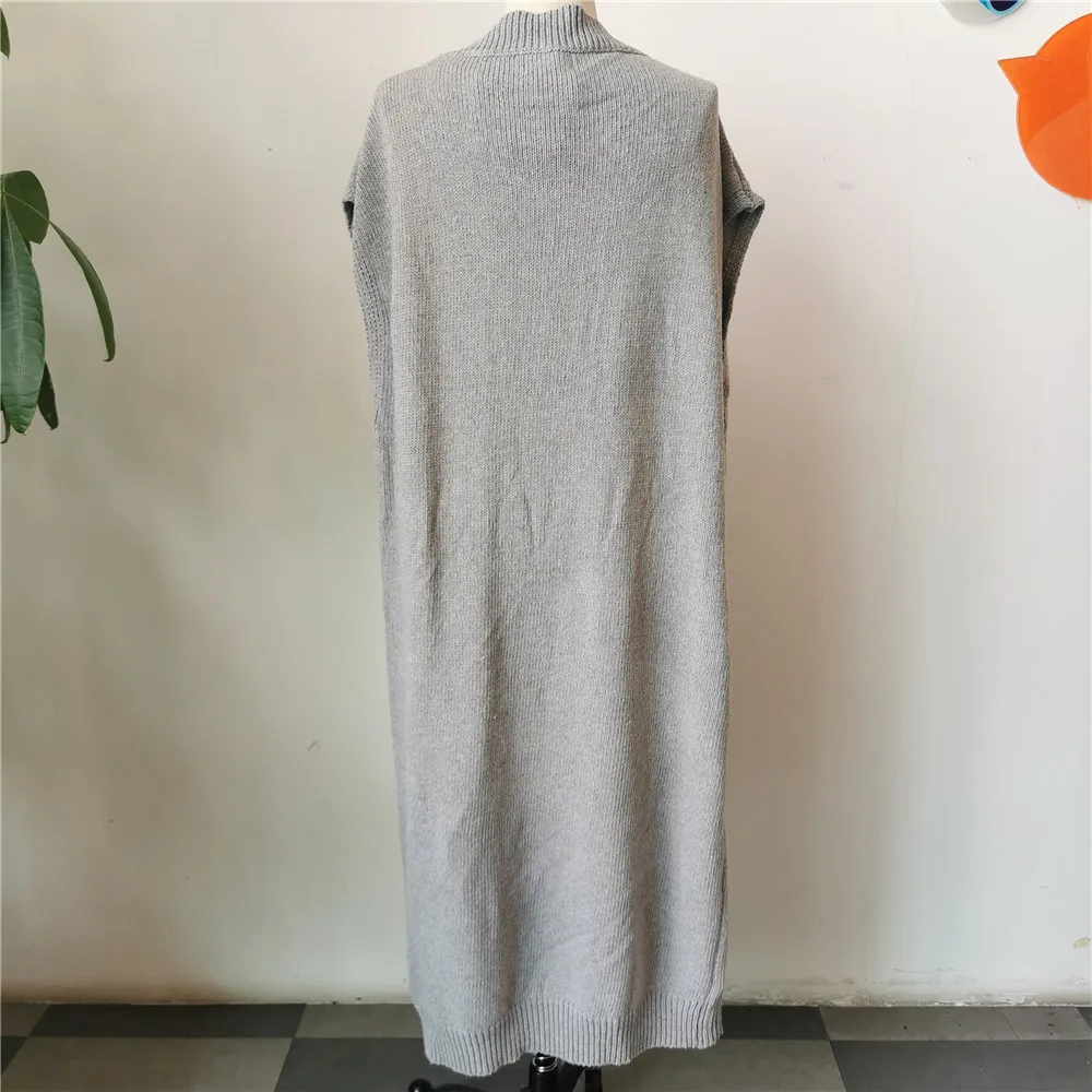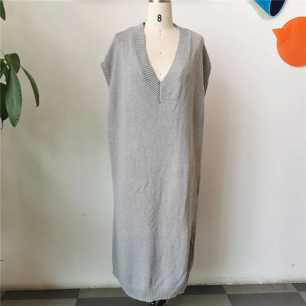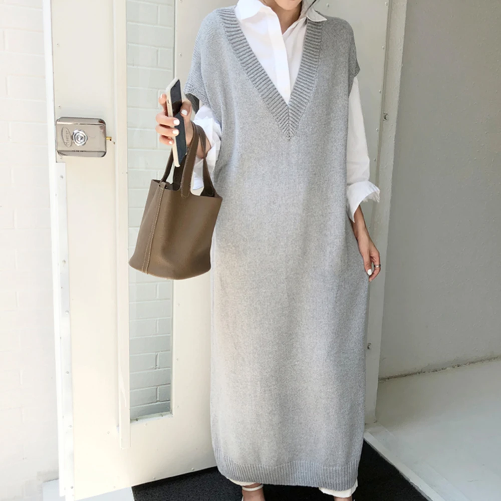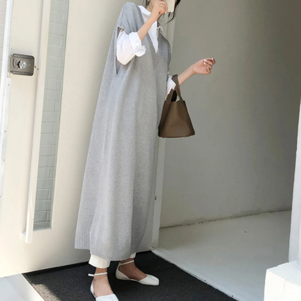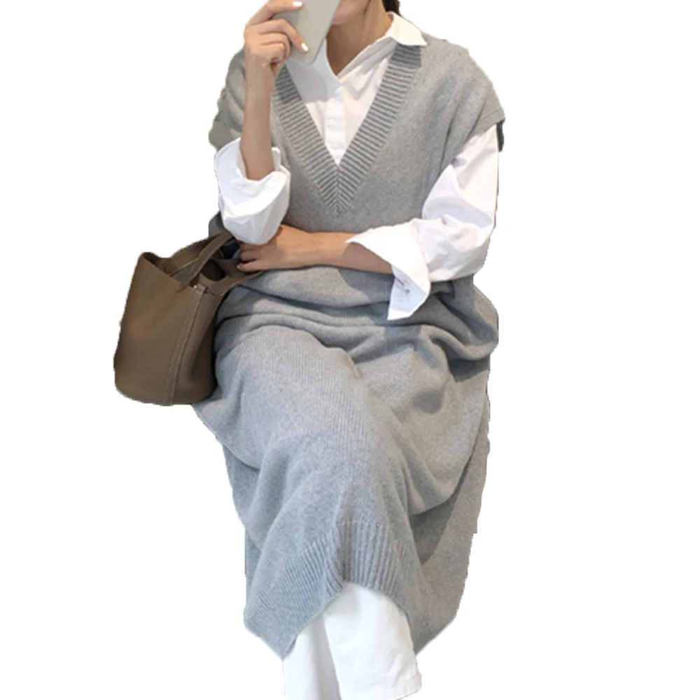Женское трикотажное платье без рукавов, однотонное свободное трикотажное платье в японском стиле с V-образным вырезом, осень 2021