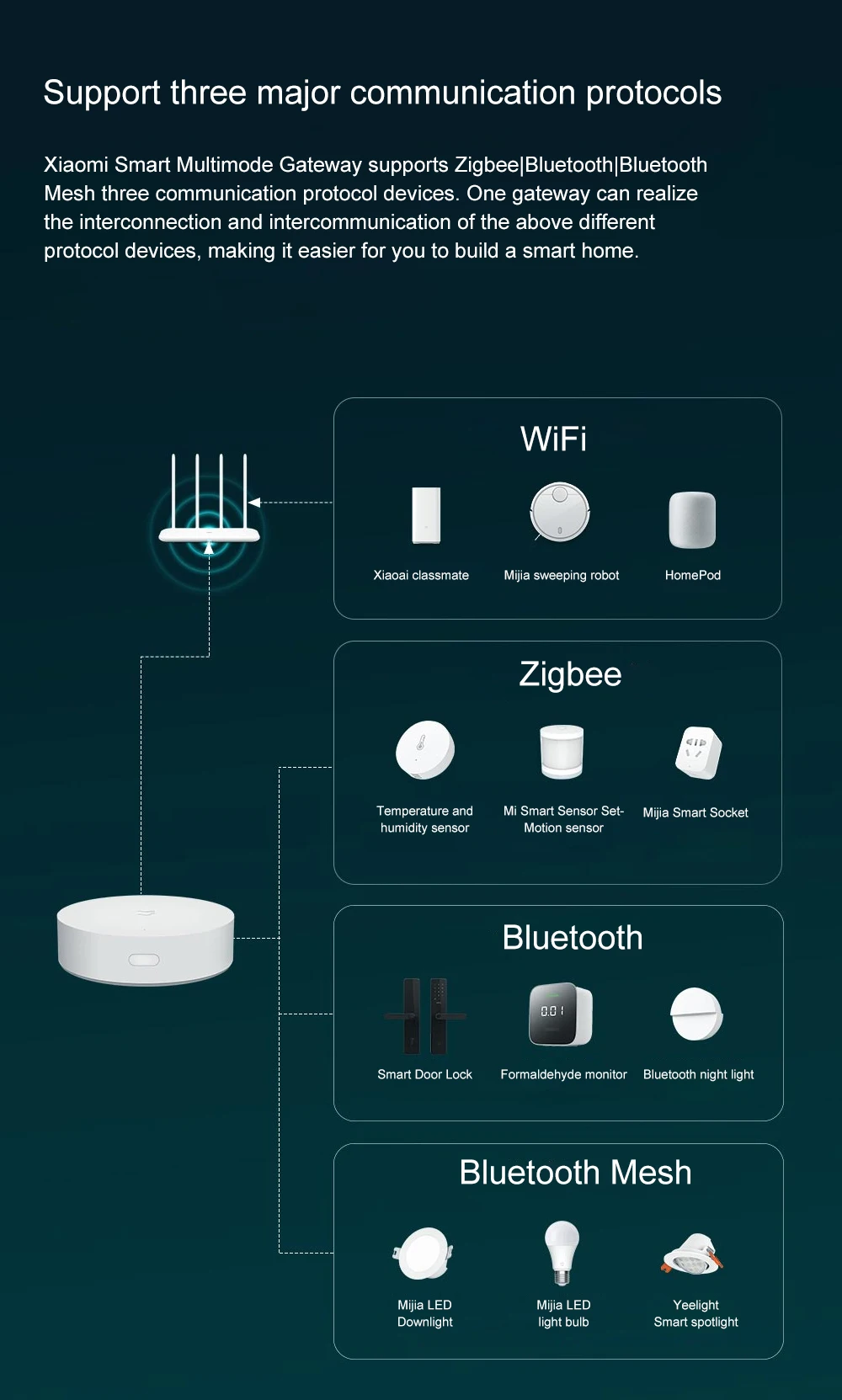 Mi Smart Home Hub-это Умный домашний центр управления, который может подключаться к Wi-Fi, Zigbee и Bluetooth-умным устройствам. Хаб и другие устройства можно свободно комбинировать в гибкую и разнообразную систему для осуществления дистанционного управления мобильными телефонами и умными сценами для устройств умного дома. Вы можете контролировать каждый аспект своего умного дома, включив светильник при возвращении домой, поворачивая устройства при выходе из дома, обнаруживая и уведомляя О ненормальных событиях и т. Д.