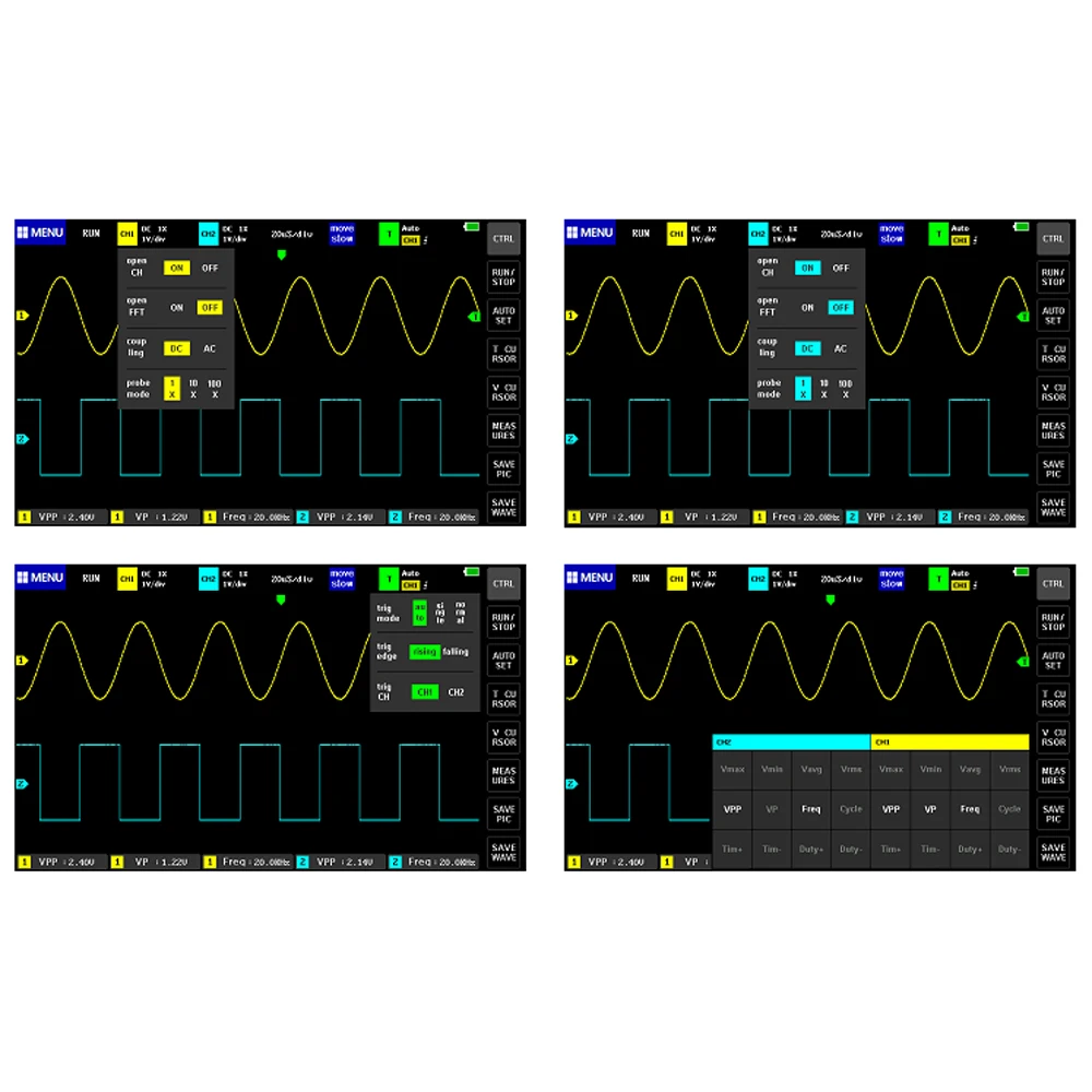 1013D-полнофункциональный, очень практичный, экономичный двухканальный плоский осциллограф для технического обслуживания и НИОКР.Особенности:Интеллектуальная защита от ожогов, 1X выдерживает выдерживаемое напряжение до 400 В.Аналоговая полоса пропускания 100 МГц @ 1GSa/s частота дискретизации (1X = 5 МГц, 10X = 100 МГц).Полностью подходит для 7-дюймового цветного TFT ЖК-дисплея с разрешением 800*480 с яркими цветами и высокой контрастностью.Емкостный сенсорный экран, такой же, как Сенсорный режим современного мобильного планшета, не является резистивным сенсорным экраном с древней работой ногтей.Диапазон высокого измерения напряжения, 1x может измерять 0 ~ 40 В, 10x может измерять 0 ~ 400 В, 100x может измерять 0 ~ 4000 в.Измерение до 12 параметров: VPP, VP, Vmax, Vmin, Vavg, Vrms, частое, долг +, долг-, время +, время-, период.Функция измерения курсора, удобно вручную измерять период, частоту и напряжение.Полная функция запуска (одиночный, нормальный, автоматический).В любое время отображение формы волны (Функция паузы) замерзает.Оснащен высокоэффективным автоматическим управлением одной кнопкой.Хранение сигналов одной кнопкой и скриншот.Встроенное хранилище объемом 1 ГБ позволяет хранить до 1000 снимков экрана + 1000 наборов данных сигналов.Мощный диспетчер изображений в форме волн поддерживает просмотр миниатюр, просмотр, Детальный просмотр, поворот страниц, удаление и масштабирование волн, уменьшение, перемещение и т. д.Оснащен интерфейсом USB, который можно подключить к компьютеру для обмена скриншотами с компьютером, что удобно для вторичного анализа.Функция графического отображения цифр Lissajous может использоваться для определения амплитуды, частоты и фазового контраста двух групп сигналов.Функция отображения БПФ может анализировать Спектральные характеристики сигнала.Встроенный перезаряжаемый литиевый аккумулятор емкостью 6000 мАч, полностью заряжается в течение 4 часов непрерывного использования при максимальной яркости экрана.Технология памяти, экран обновления сигнала не мерцает.Регулировка яркости экрана.Ультратонкий, удобный для переноски.Характеристики:Материал: АБСЦвет: черный + белыйШирина аналогового диапазона: 100 МГц * 2Количество каналов: 2 каналаМаксимальная частота дискретизации в реальном времени: 1 ГСА/сВертикальная чувствительность: 50 мВ/дел ~ 500 В/делГоризонтальный временной базовый Диапазон: 50 с/дел ~ 10 нс/делМаксимальное испытательное напряжение: 40 В (1X зонд), 400 В (10X зонд)Глубина хранения: 240 кбитВходное сопротивление: 1 мТочность АЦП: 8 битРежим связи: AC/DCРежим триггера: одиночный, нормальный, автоматическийТРИГГЕРНАЯ Кромка: поднимающаяся кромка/опускающаяся кромкаВнешнее триггерное напряжение: 0 ~ 40 вДисплей: 7 дюймов-800*480Применение: емкостный сенсорный экран + жестУдлинительные порты: экспорт изображений USBИсточник питания: 1 * литиевый аккумулятор, 6000 мАч (входит в комплект)Размер изделия: 184*124*50 мм/7,2*4,9 * дюймаПосылка: 230*150*60 мм/9,1*5,9 * 2.4inВес посылка: 1000 г/фунтаУпаковочный лист:Хост осциллографа 1 * 1013D2 * соответствующий зонд 100 МГц (1X и 10X)1 * USB линия передачи данных1 * Руководство пользователя (на английском языке)