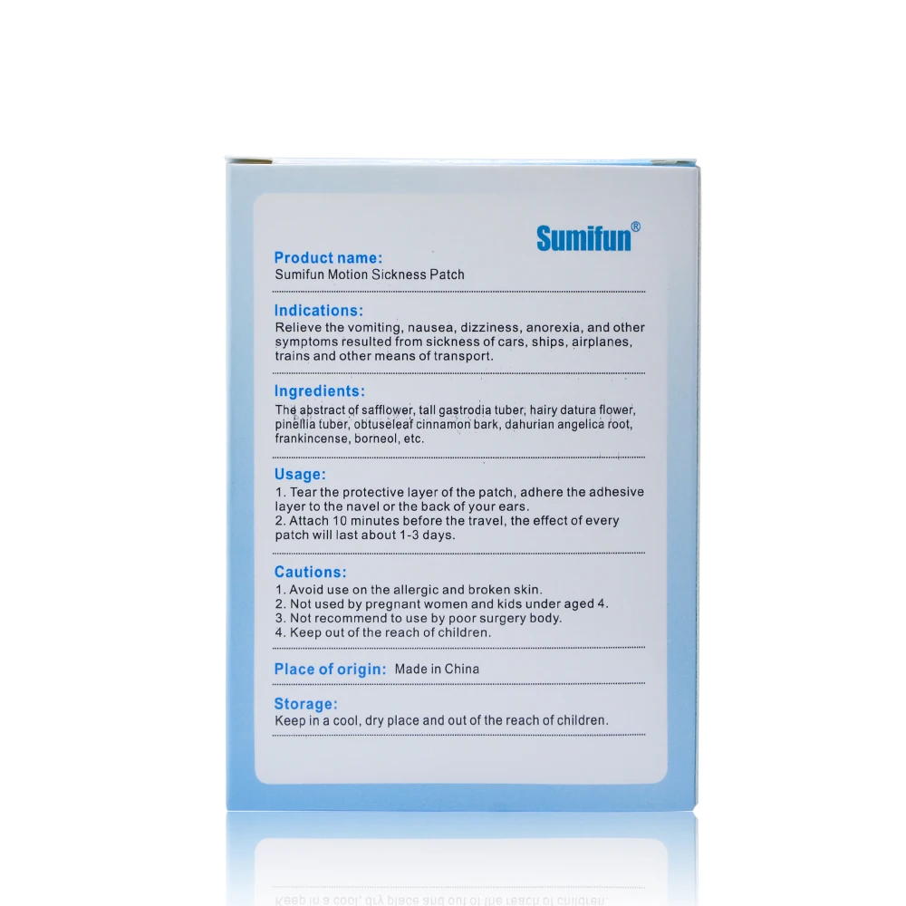 Посылка входит: 72 шт. = 2 коробки пластырей (36 шт. упакованы в одну коробку)Применение:Облегчение рвоты, тошноты, головокружения, анорексии и других симптомов, вызванных болезнью автомобилей, кораблей, самолетов, поездов и других транспортных средств.Ингредиент:Экстракты трав. Такие как сафлор, высокий клубень гастродии, цветок волосатой датуры, клубень пинелии, кора корицы обтуселеаф, корень дахурианской ангелики, ладан, борнеол и т. д.Использование:1. Оторвите защитный слой пластыря, приклейте клейкий слой КПупок или тыльная часть ушей.2. Прикрепите за 10 минут до путешествия, эффект от каждого пластыря длится около 1-3 дней.Примечание:1. Пожалуйста, не используйте на поврежденной коже или ранах.2. Беременным и младенцам младше 4 лет нельзя использовать.3. Пожалуйста, держите кожу чистой и сухой перед использованием.