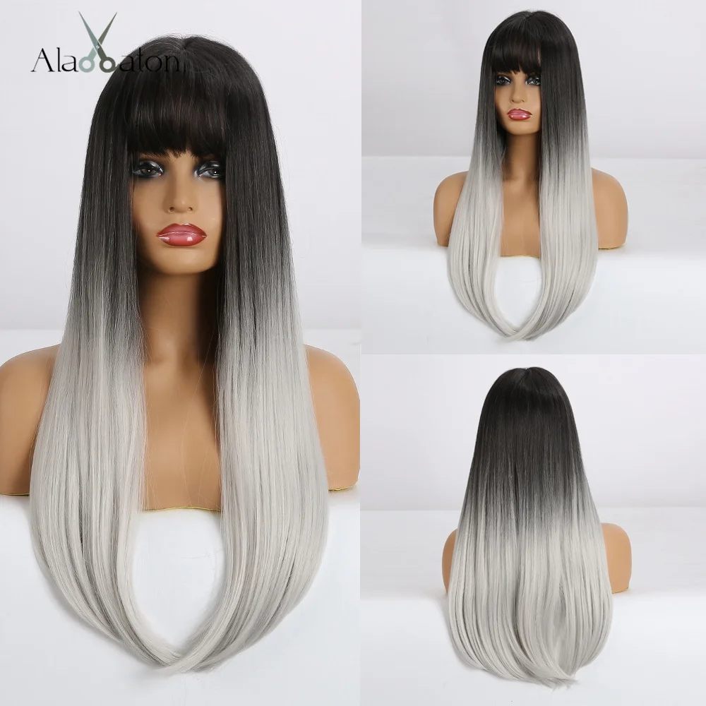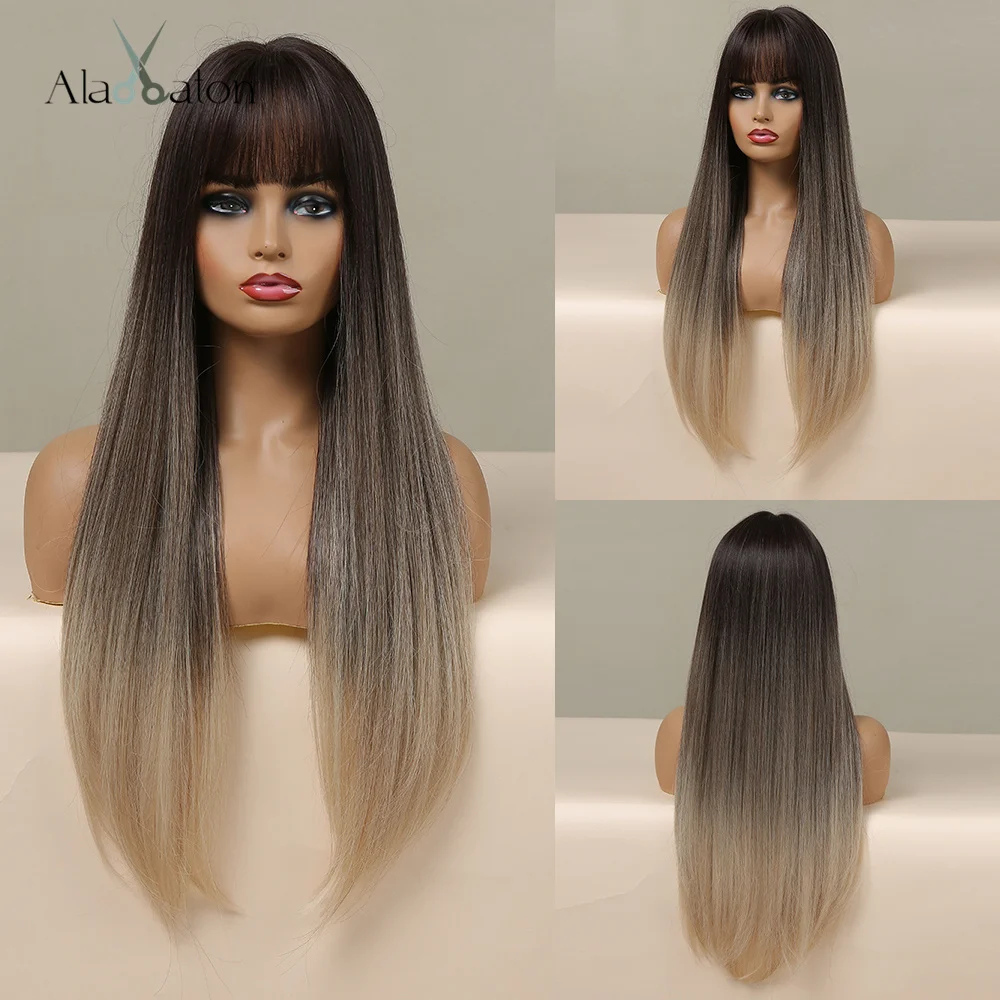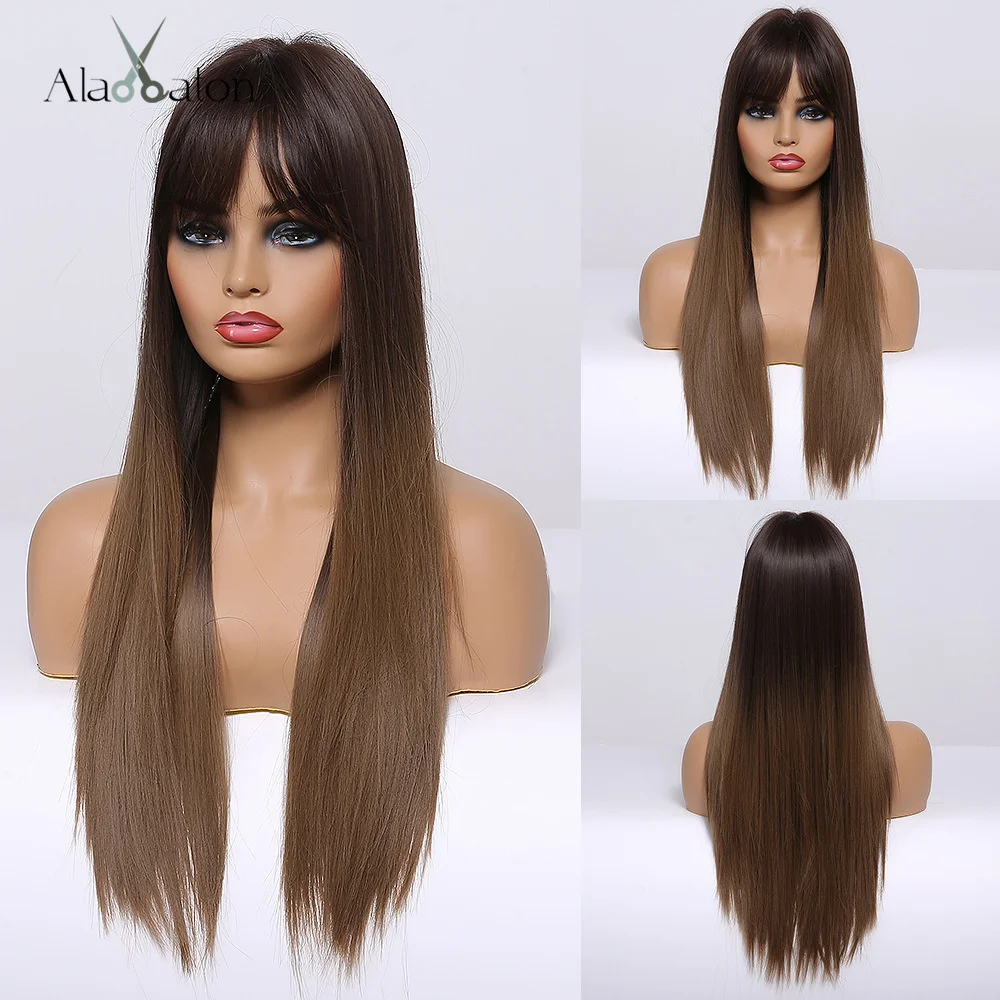 ALAN EATON, Длинные прямые синтетические волосы, парики для женщин, Омбре, черные, темно-коричневые, косплей, повседневные, вечерние, термостойкие парики с челкой