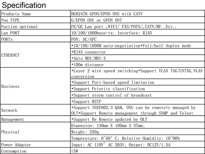 HG8247H5-это оборудование для доступа к пропускной способности FTTH. Основываясь на зрелых и стабильных технологиях G/EPON, он имеет мощные функции с высокой стабильностью, комплексным управлением и гибкой сетевой конструкцией. Он использует технологию WDM с одиночным волокном с длиной волны нисходящего канала 1490нм, длиной волны восходящего канала 1310нм. Для передачи данных требуется только одно ядро волокна. Он имеет 1 PON порт, 1GE + 3*10/100BASE-T порты и один CATV выход.