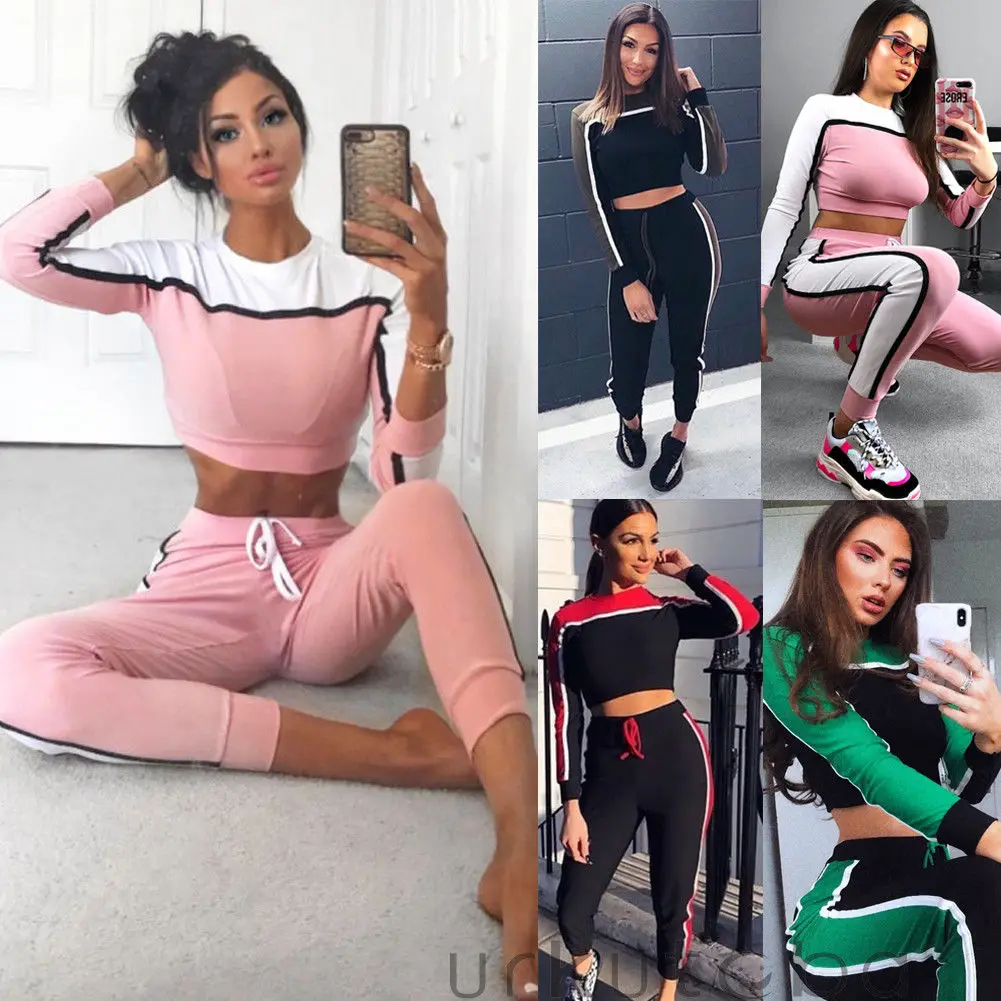 Женский спортивный костюм, спортивная одежда, лоскутный кроп-топ с длинным рукавом и длинные брюки на шнуровке, костюм одежды