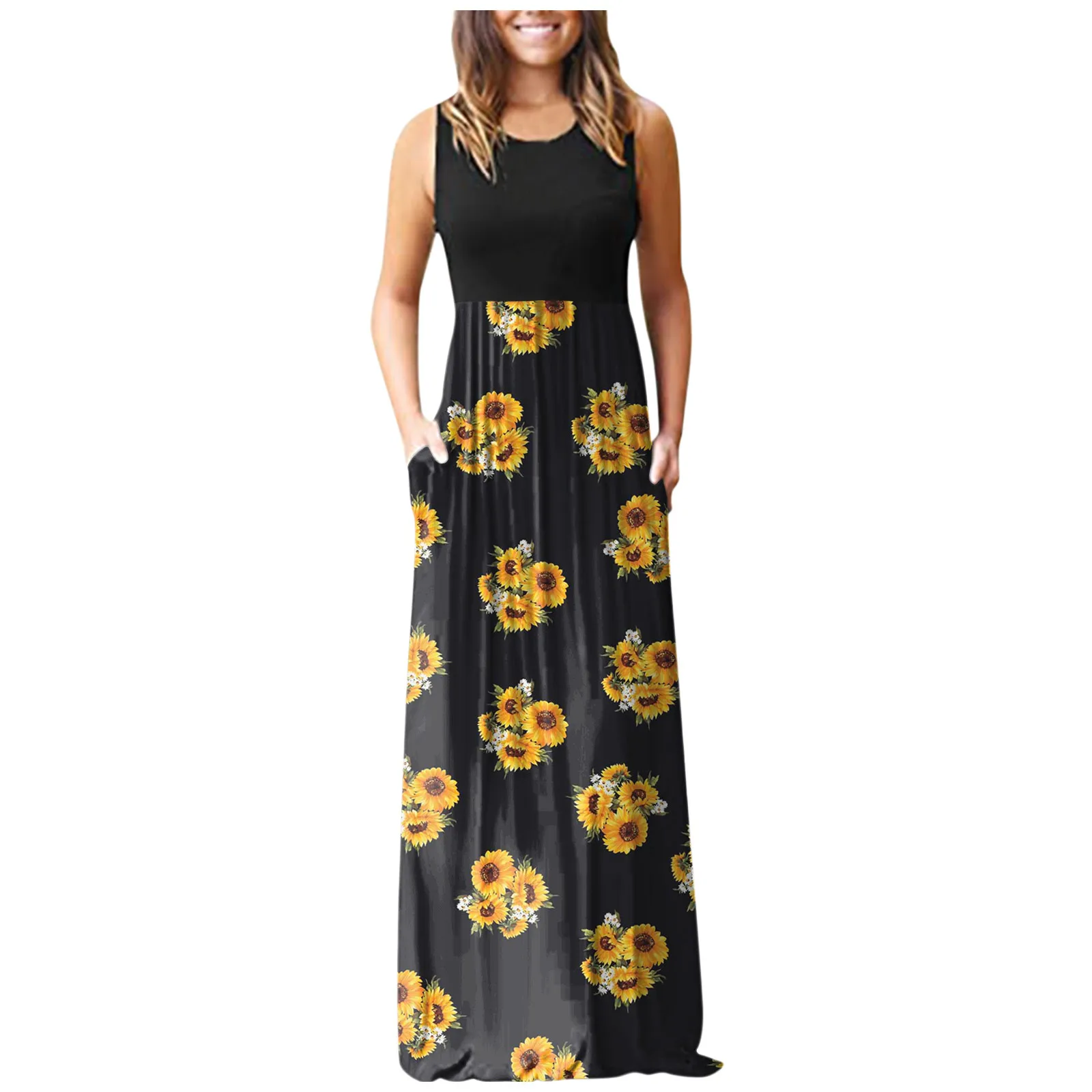 Женское повседневное длинное пляжное платье макси без рукавов с карманами и цветочным принтом